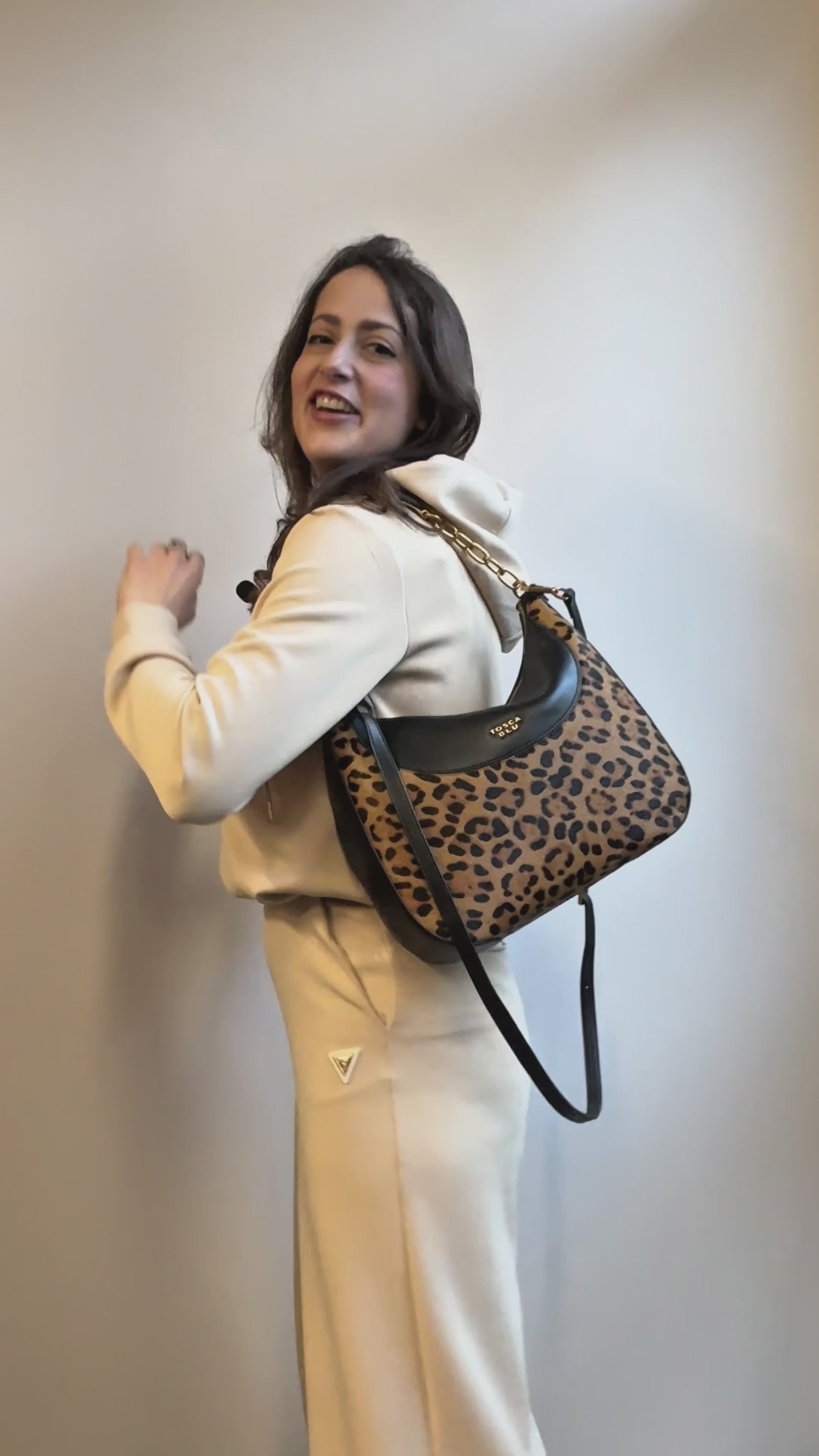 Nannini Firenze Borsa a Mano Glamour Donna in Pelle Nero Latte con Stampa Leopardata