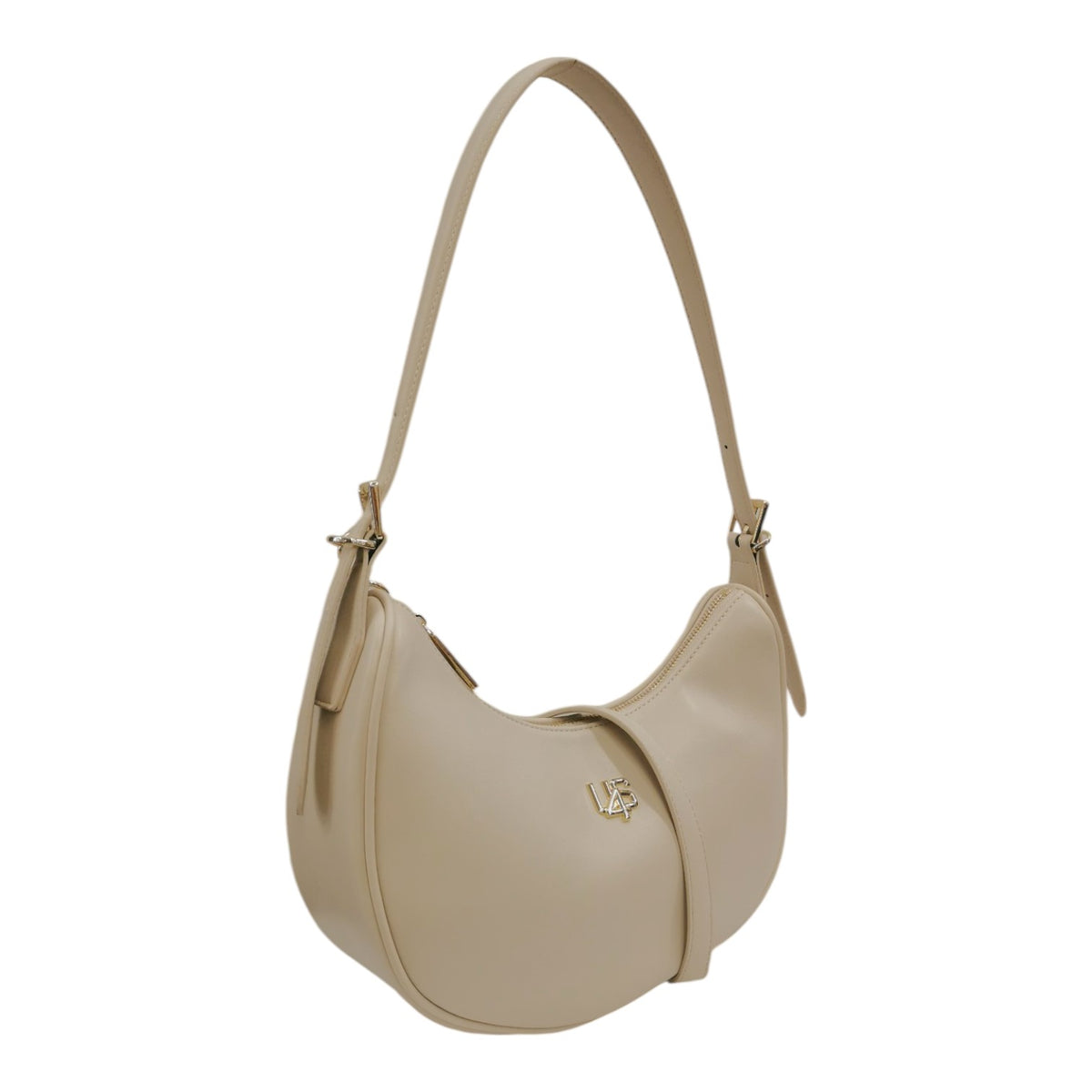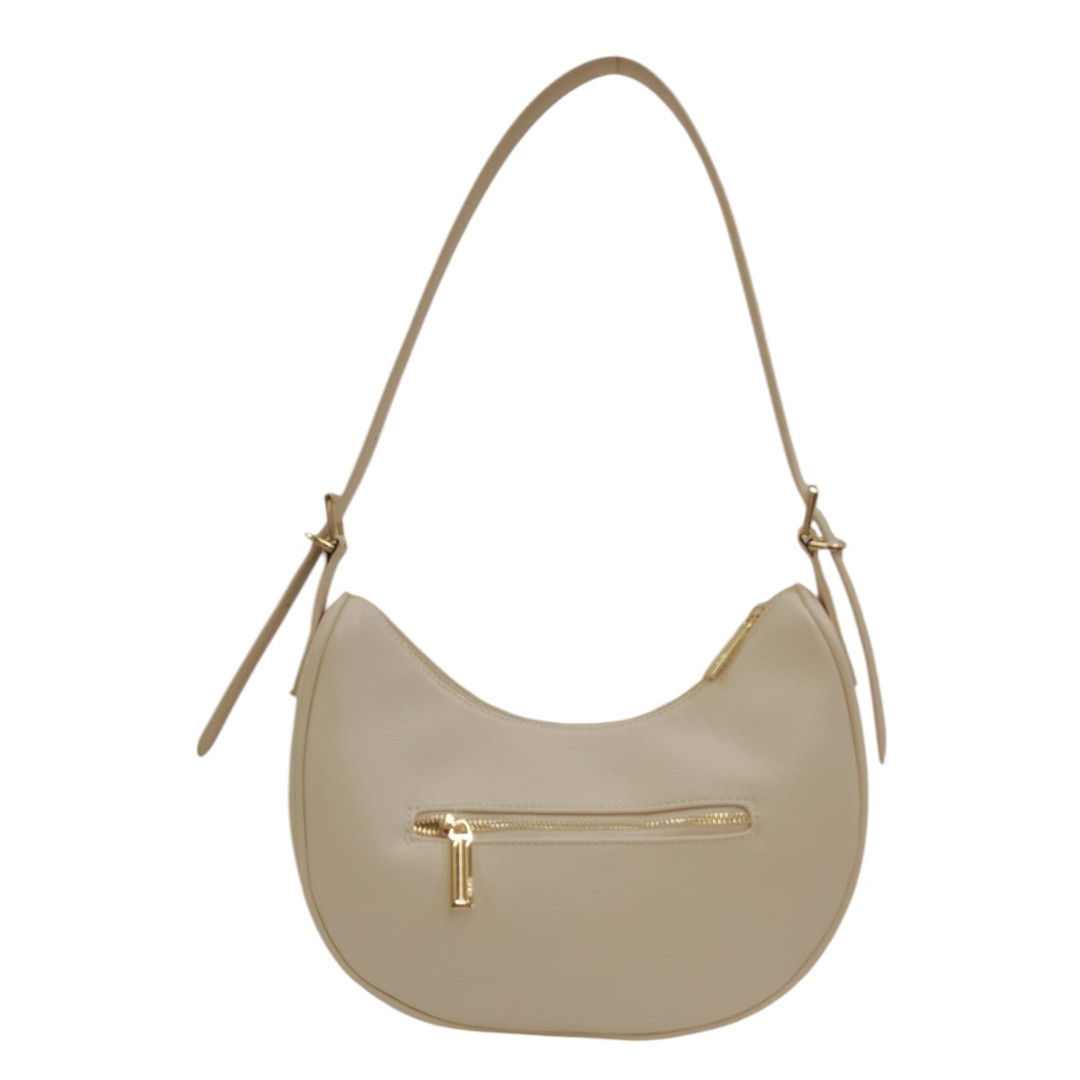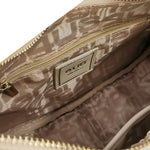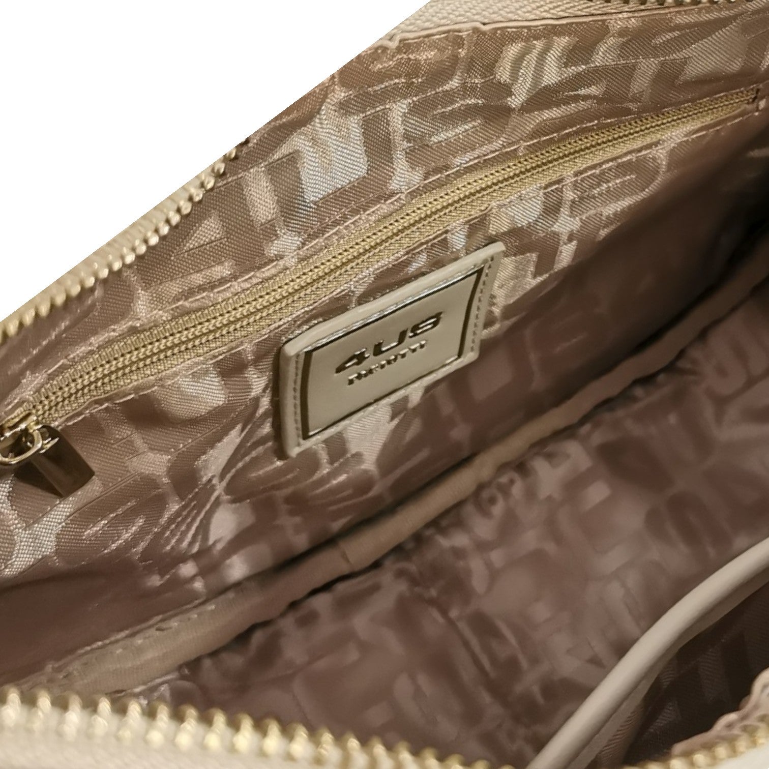 La Mezzaluna firmata 4us by Paciotti, realizzata in ecopelle nella variante sabbia è caratterizzata da logo frontale in metallo e da tracolla a catena ed ecopelle. Presenta l'interno foderato in tessuto logato di cui dispone di tasca con zip e aperta.