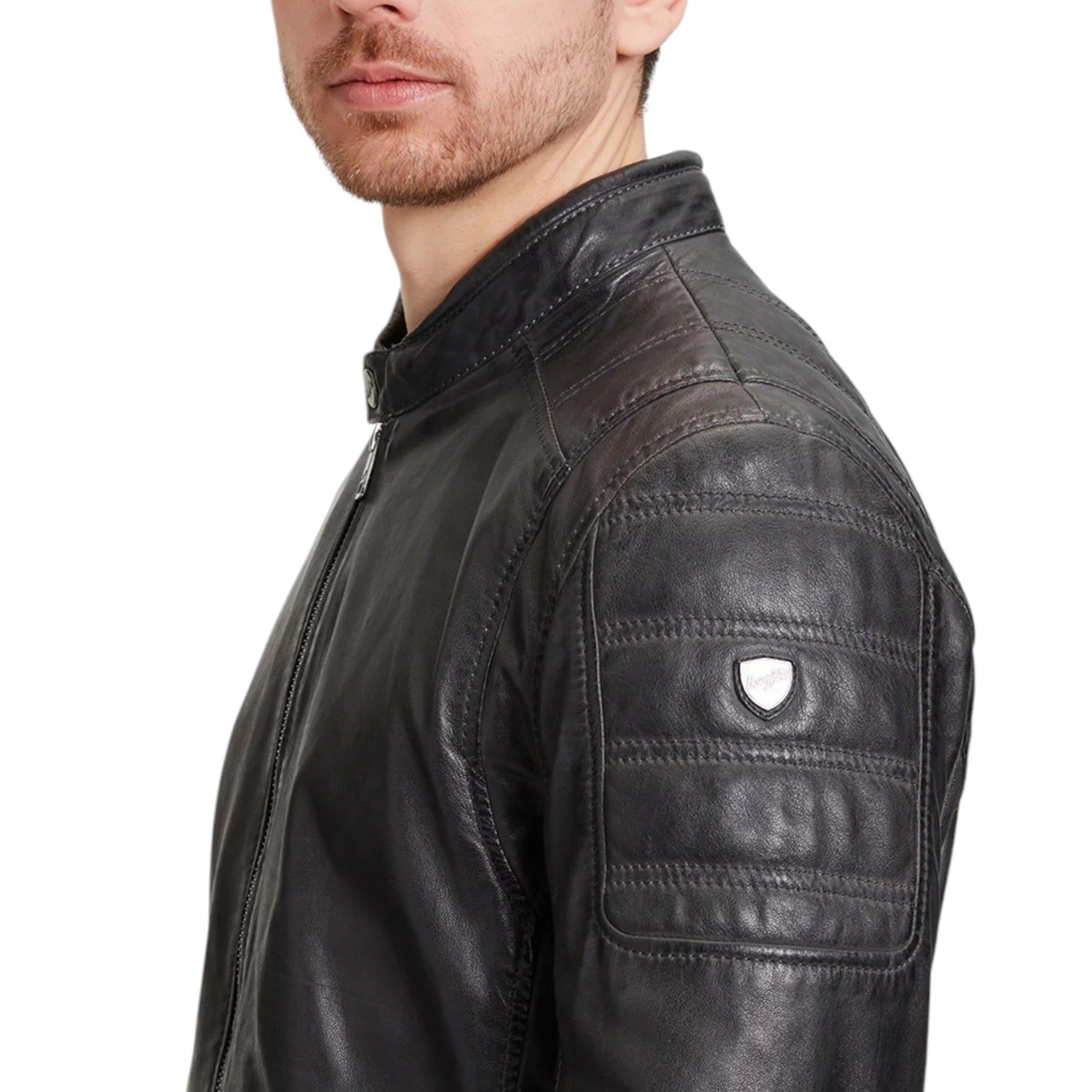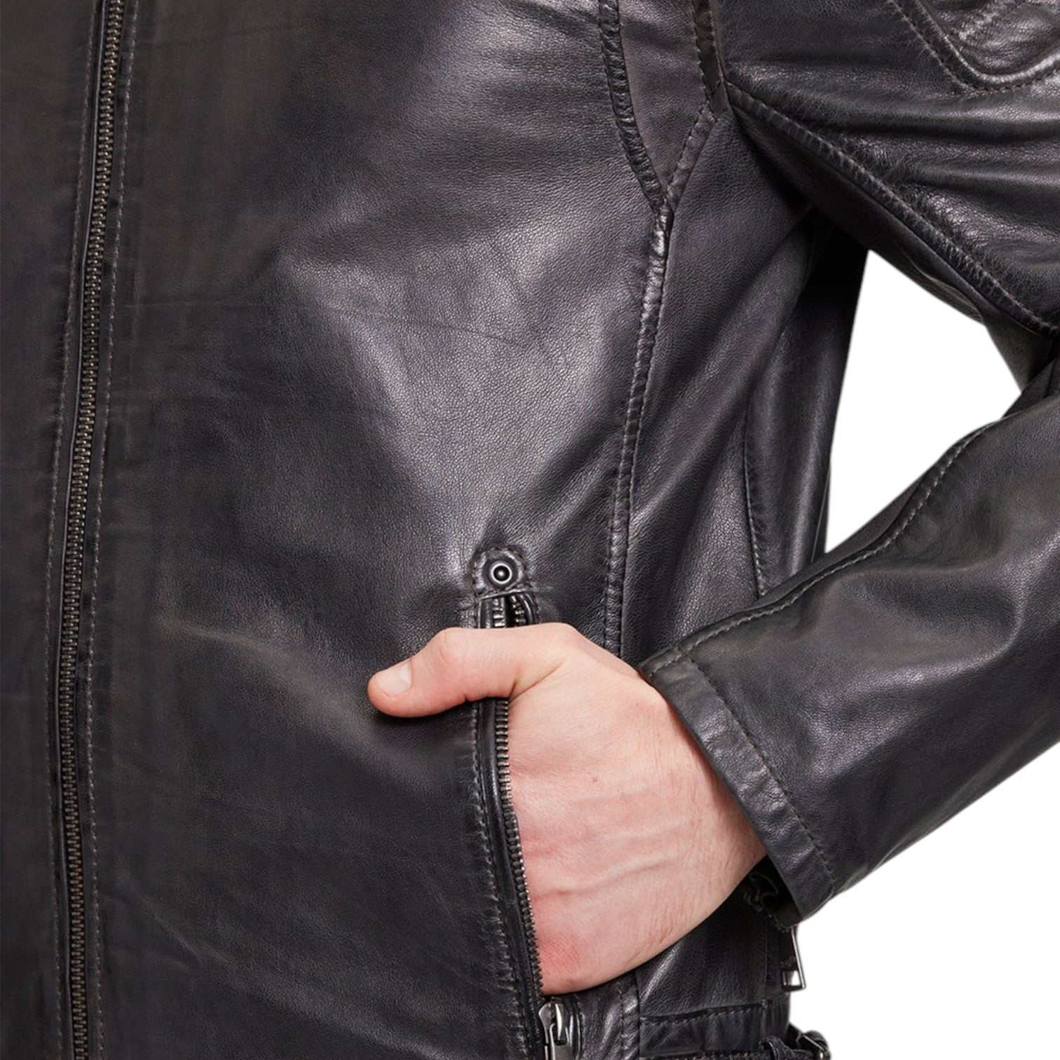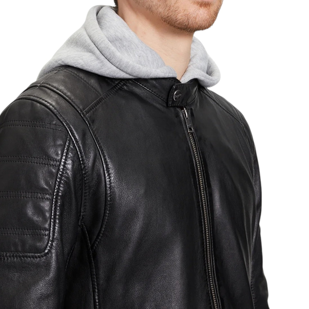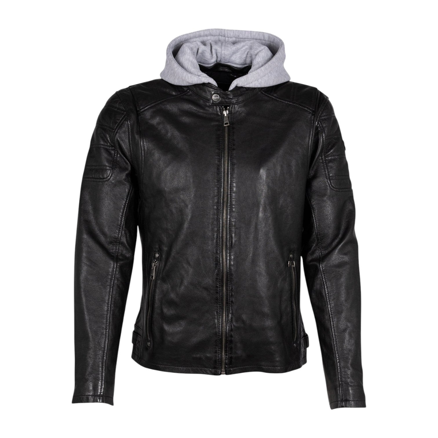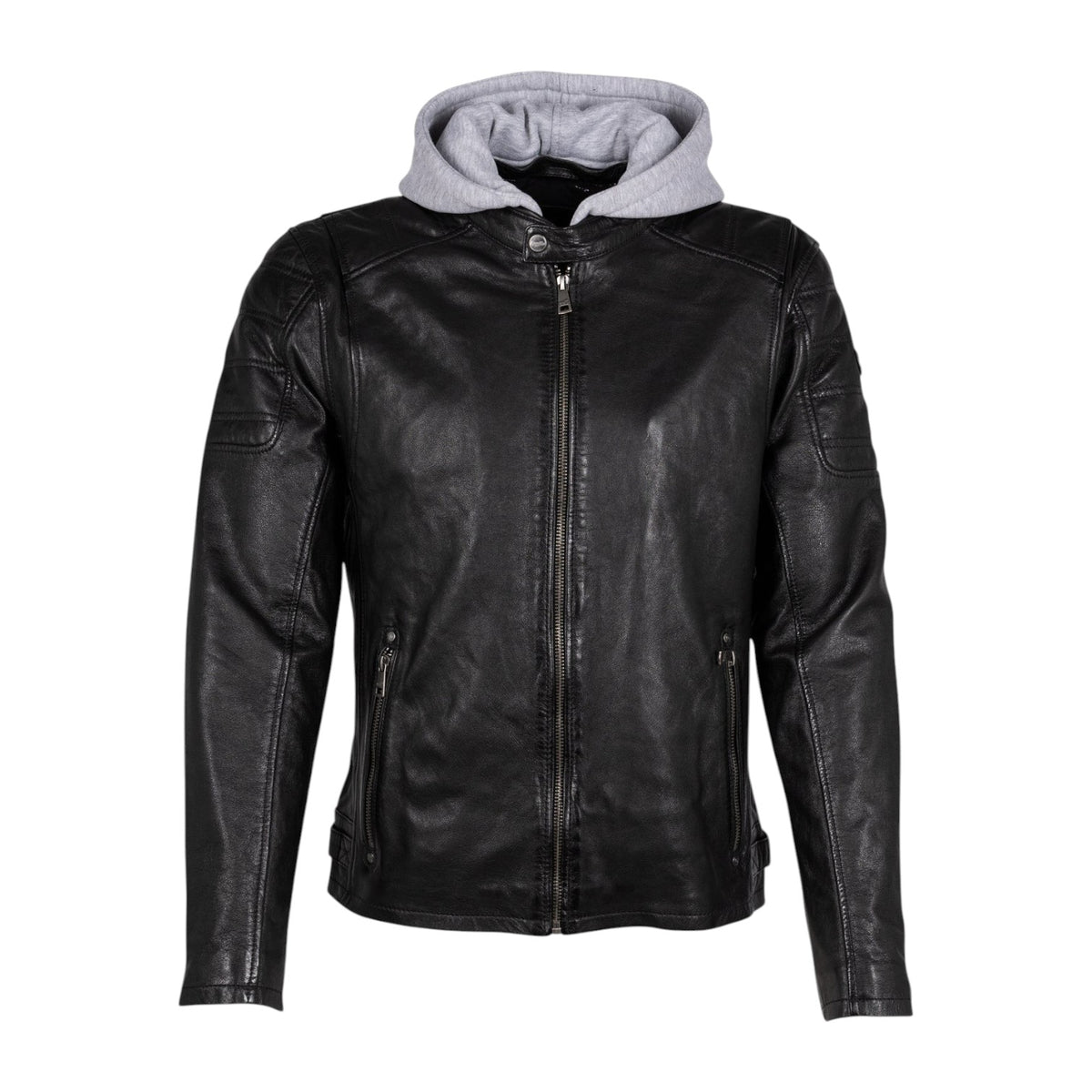 Il Giubbotto firmato Mauritius, modello da motociclista realizzato in pelle è caratterizzato da cappuccio in felpa rimovibile e da colletto alto con bottone automatico, inoltre dispone di cerniera sul retro delle maniche e di due tasche laterali con cerniera. Presenta spalle e parte superiore del braccio trapuntate con fibbie sulla cintura laterale.