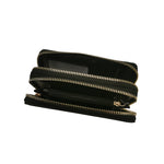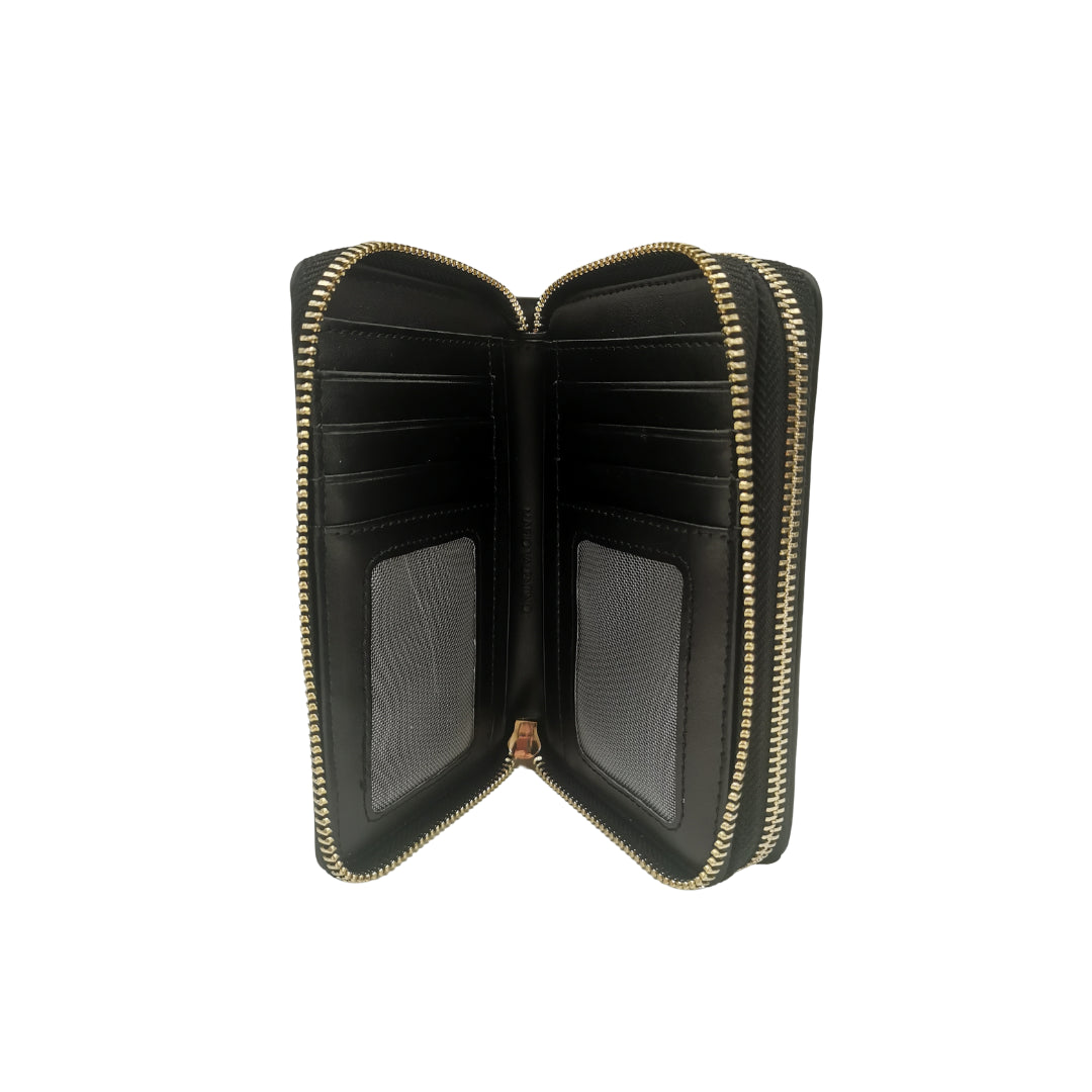 Il portafoglio firmato Mario Valentino da Donna in ecopelle martellata nera, è caratterizzato da due scomparti separati con zip esterne, una dispone di 8 slots per le carte e scompartimento per le banconote, l'altra tasca è realizzata per contenere le monete.
