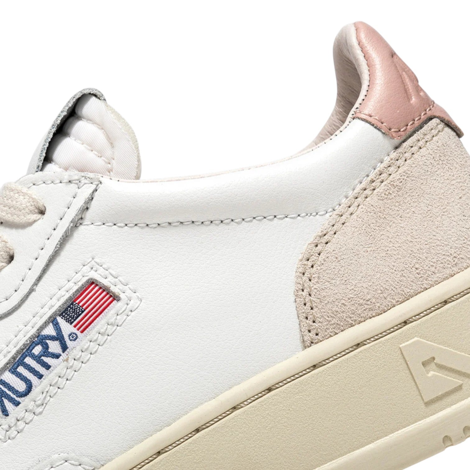 La Sneakers firmata Autry, realizzata in pelle bianca dall'aspetto autentico ed è rifinita con rinforzi in suede beige per un mix tattile e grafico deciso. Il dettaglio in pelle rosa che decora il tallone è personalizzato con il logo Autry. Fodera in pelle e spugna di cotone e soletta in pelle rialzata di 2cm.