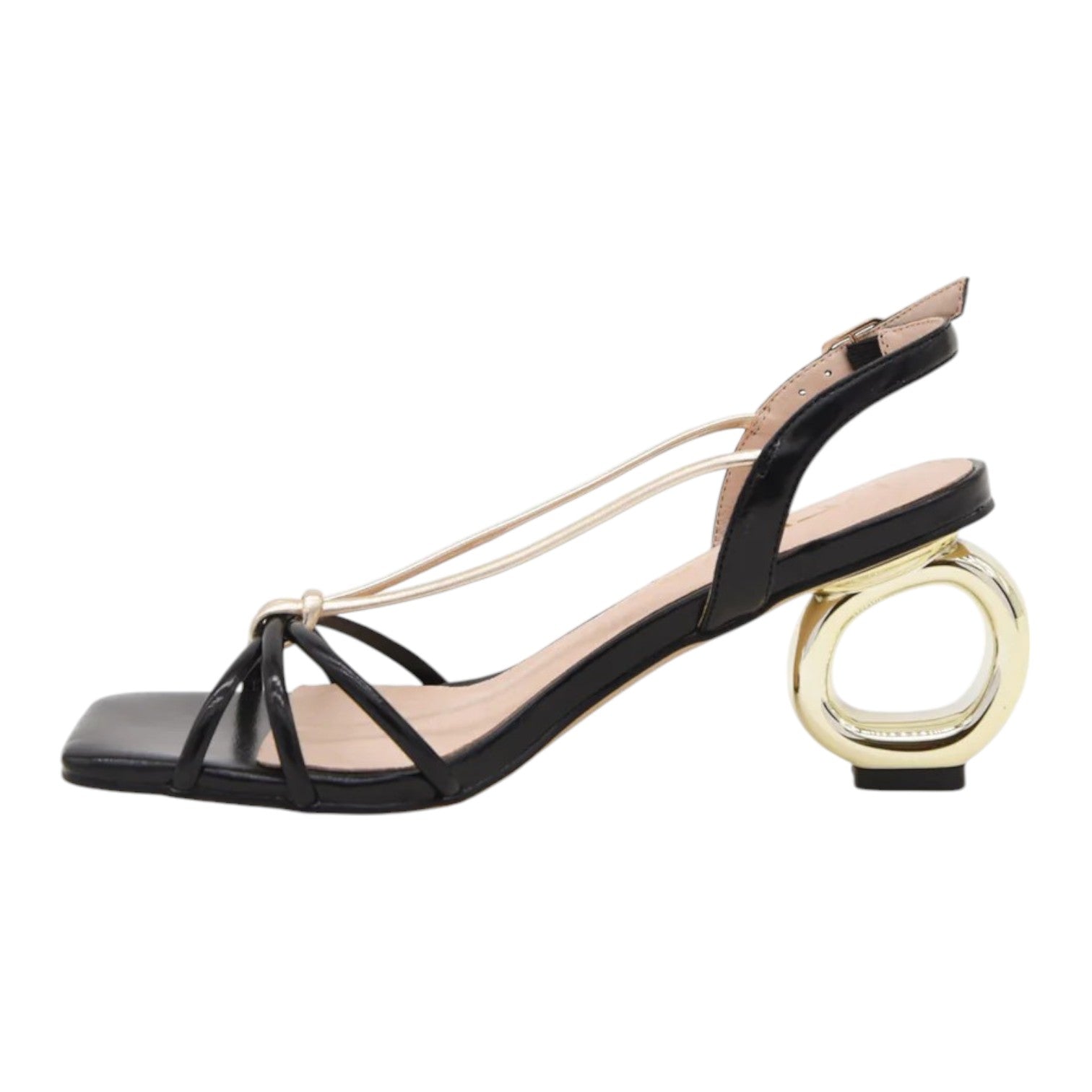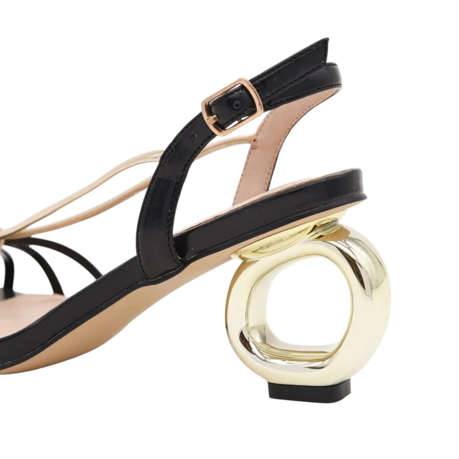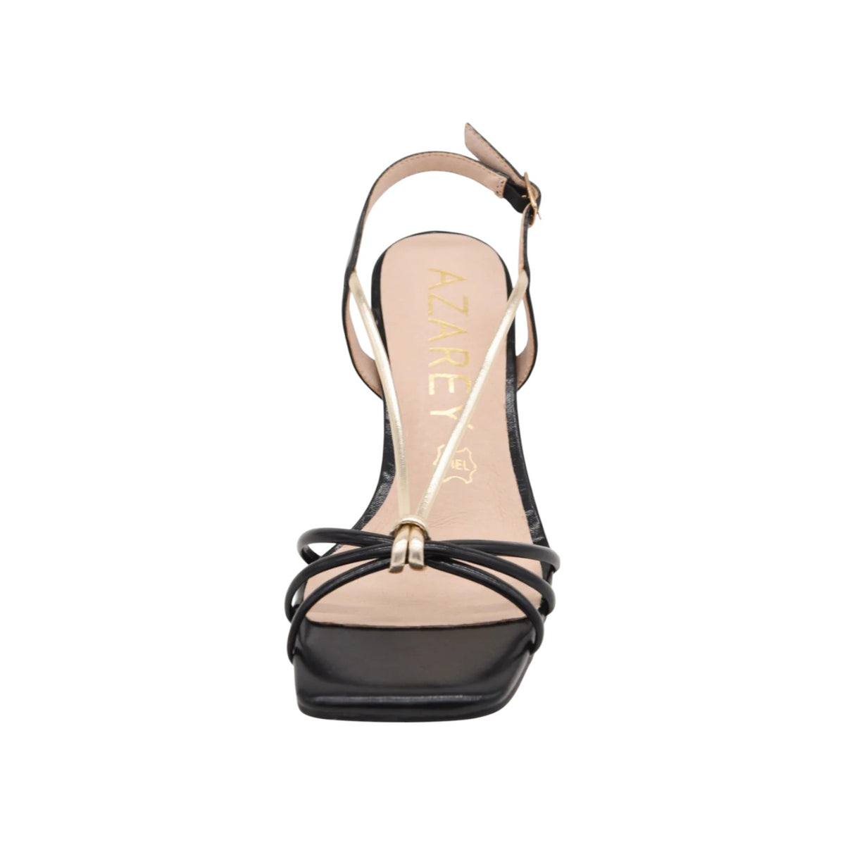 Il Sandalo firmato Azarey, realizzato in ecopelle presenta design minimalista unisce sottili cinturini neri a dettagli dorati che aggiungono un tocco di raffinatezza. Il tacco speciale non è solo un elemento unico, ma garantisce anche un passo stabile e confortevole.