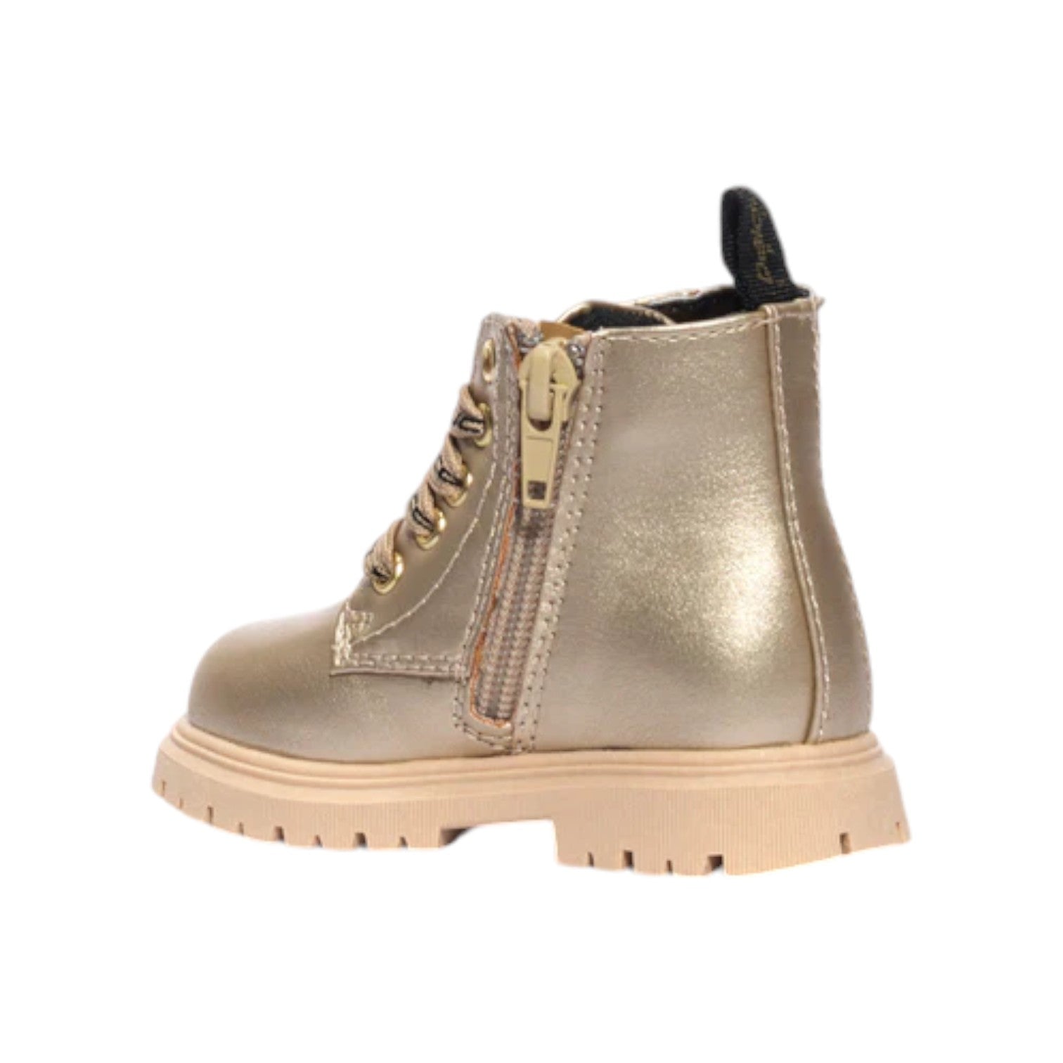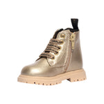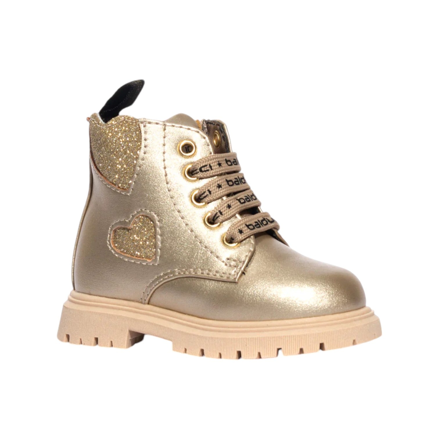 L'Anfibio firmato Balducci Sport, realizzato in ecopelle laminata dorata è caratterizzata da due cuoricini laterali con glitter e da una chiusura con lacci e zip laterale garantiscono una calzata comoda e sicura, inoltre l'interno è foderato in tessuto imbottito caldo con plantare rivestito in pelle.