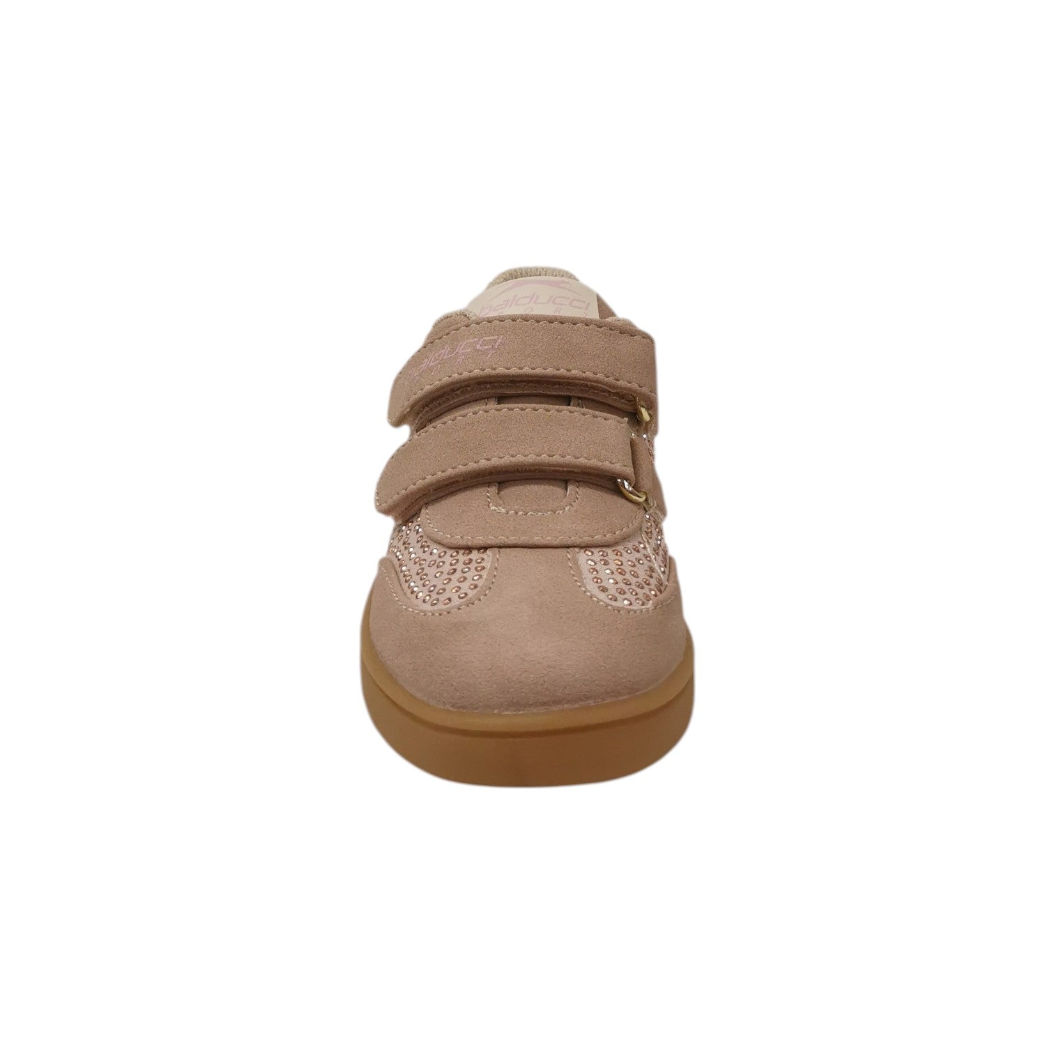 La Sneakers firmata Balducci, realizzata in camoscio sintetico in questa variante bellissima rosa è caratterizzata da inserti bianchi e strass rosa, inoltre dispone di comoda doppia chiusura a strappo e plantarino in pelle.