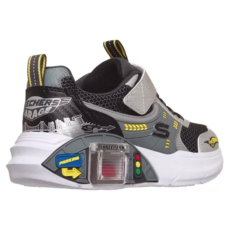 La Sneakers firmata Skechers, con chiusura adattiva presenta una tomaia in mesh e rivestimento sintetico con accattivanti grafiche a tema automobilistico, lacci elastici fissi e cinturino regolabile sul collo del piede. Questo design giocoso è completo di un garage scorrevole sull'intersuola e include due macchinine giocattolo che possono essere riposte all'interno!