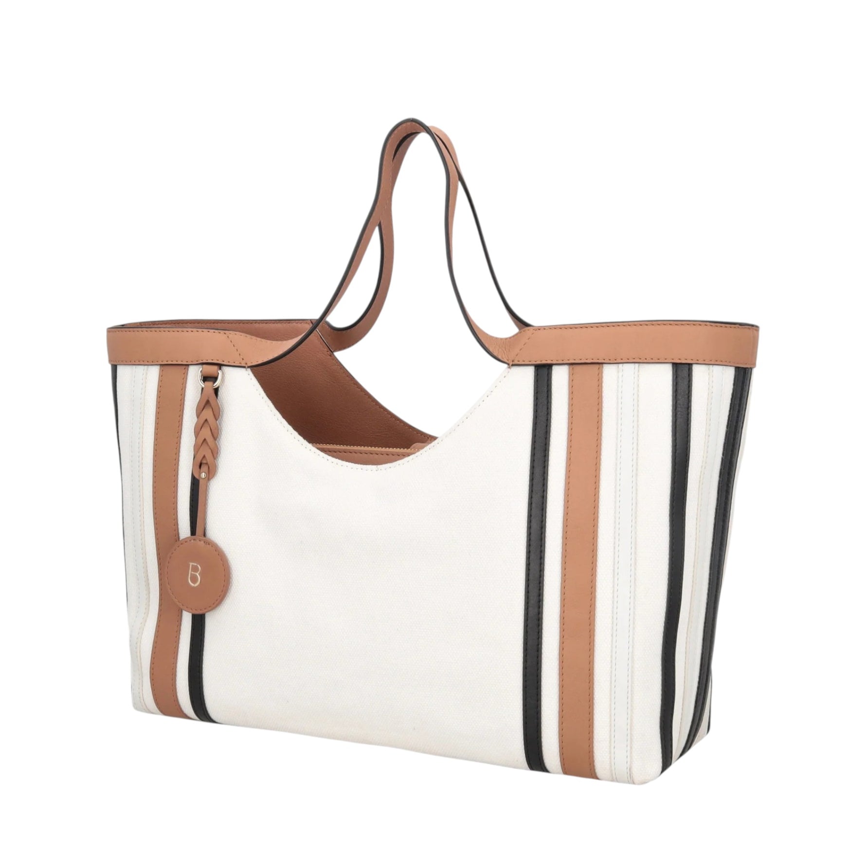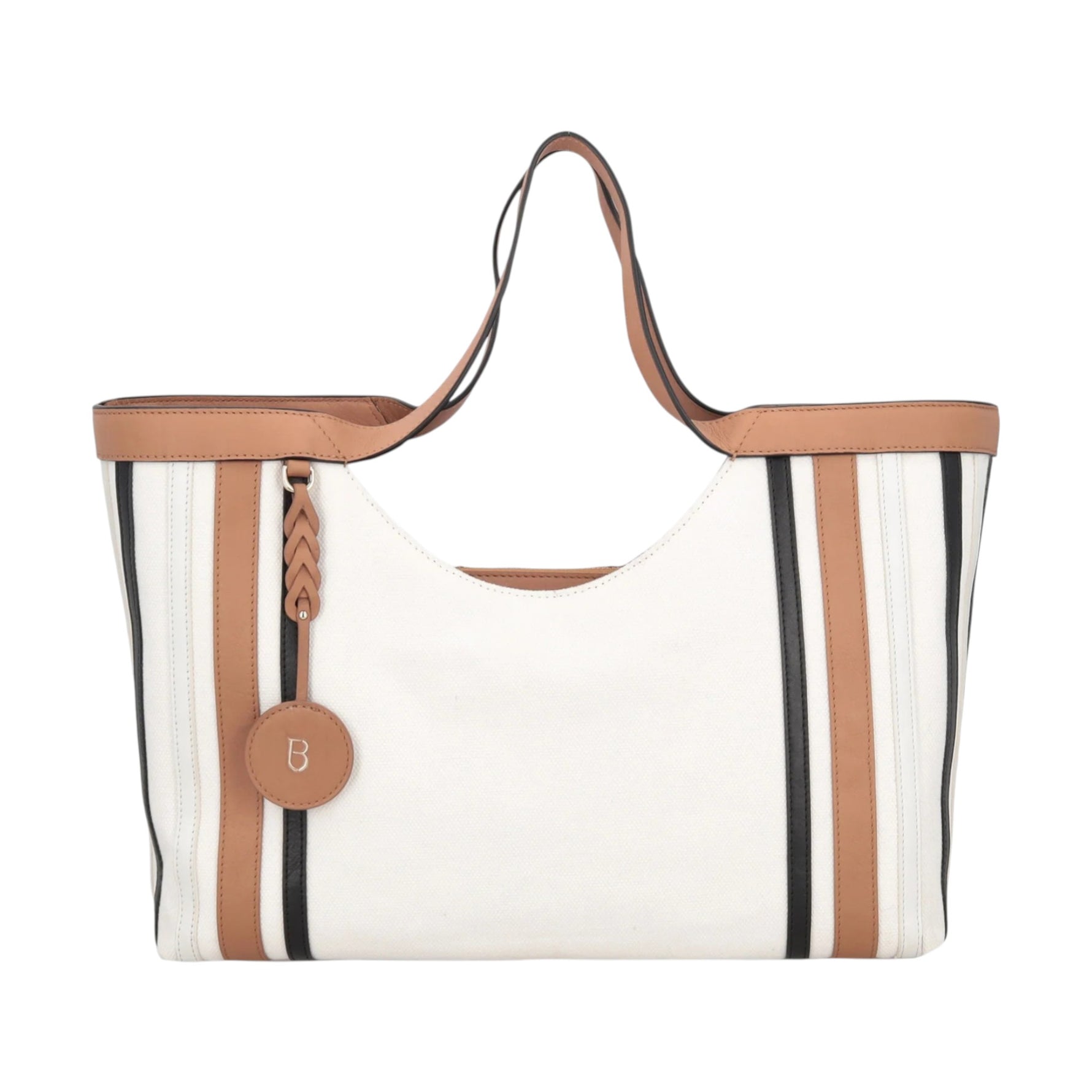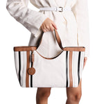 La Borsa a mano firmata Tosca Blu, realizzata in tessuto con charm in cotone e inserti in pelle color biscotto. La silhouette ampia è valorizzata da inserti verticali a contrasto che slanciano e donano ritmo al design, mentre il charm logato con intreccio aggiunge un accento ricercato. Il comodo manico consente di portarla borsa a mano o a spalla, accompagnandoti con disinvoltura le giornate più intense. Spaziosa e ben strutturata, la shopping bag con charm è dotata di ben tre scomparti interni, perfetta per una donna che sceglie accessori versatili e capaci di coniugare funzionalità ed eleganza senza eccessi.
