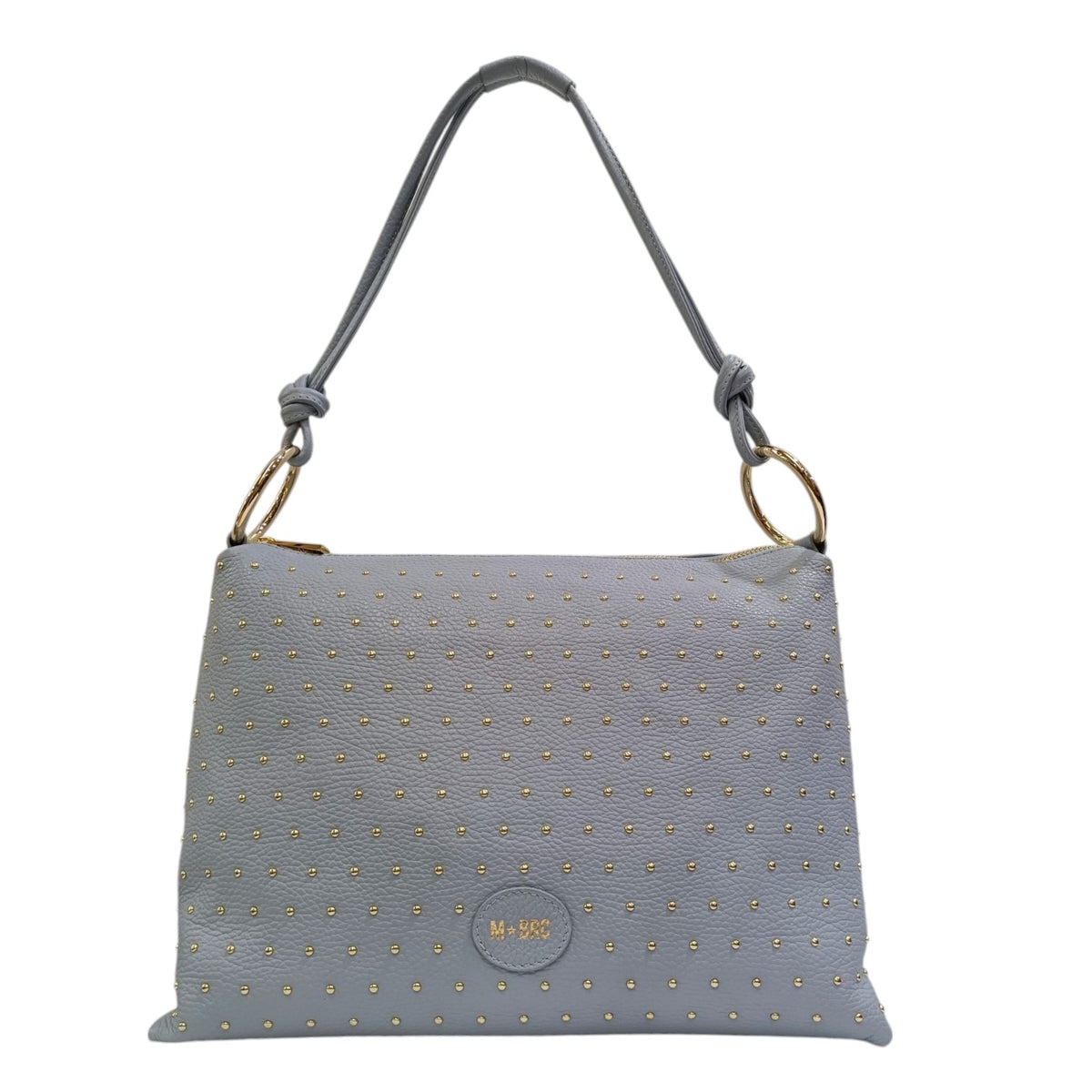 La Borsa a spalla firmata M Brc, della Linea Star Dust realizzata in pelle morbida martellata è caratterizzata da applicazione di mini borchie dorate e da interno foderato in tessuto di cui dispone di tasca chiusa con zip e due aperte. Grazie al suo design elegante, è perfetta per ogni occasione.