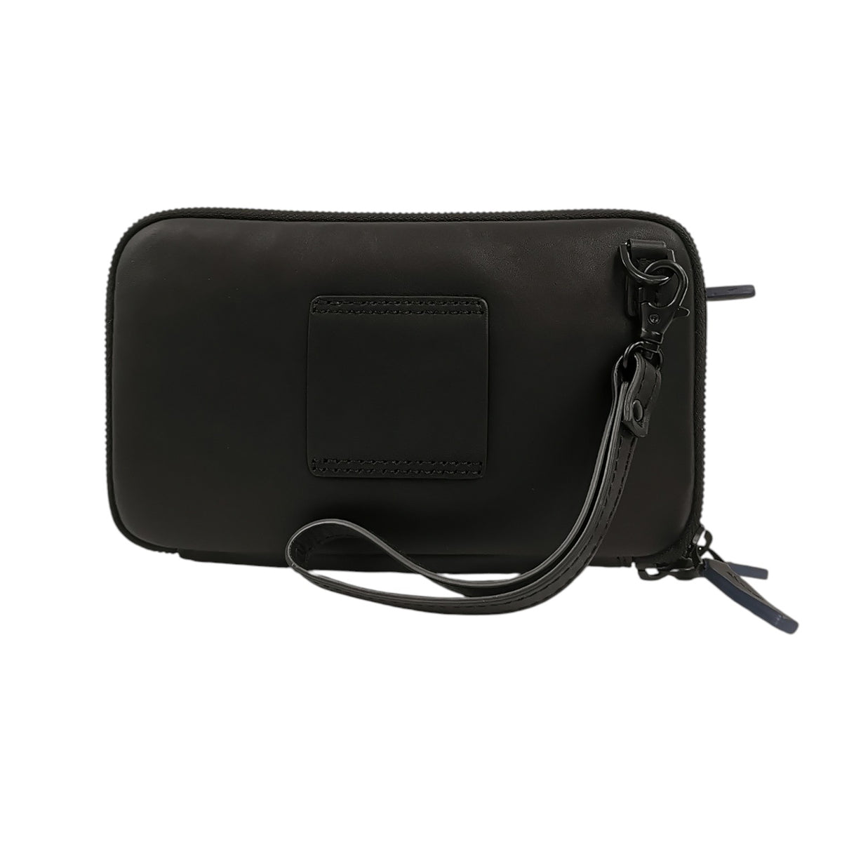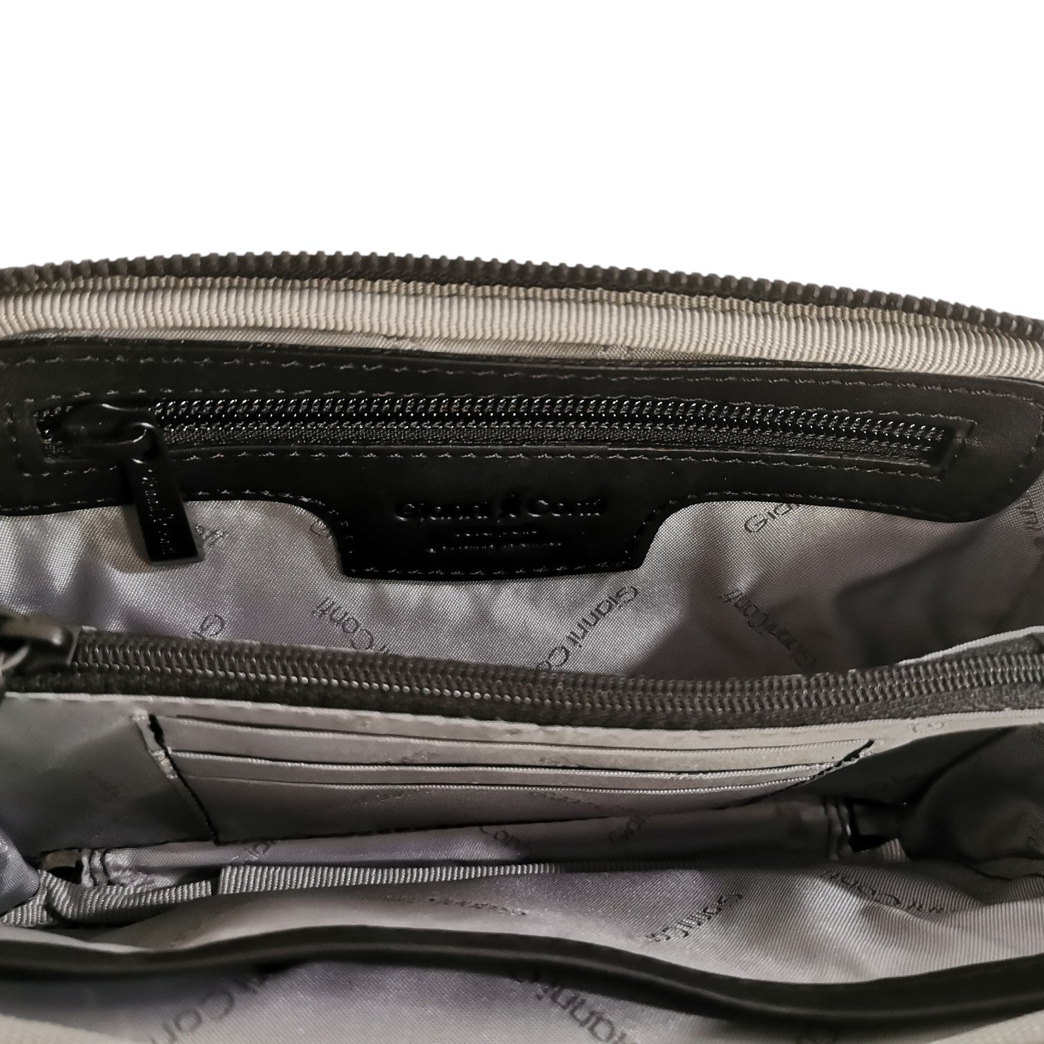 La Pochette firmata Gianni Conti, realizzata in pelle nera è caratterizzata da taschino frontale con polsino removibile e da interno foderato in tessuto con 3 scomparti di cui quello centrale chiuso con zip e dispone di una tasca aperta e una con zip.