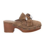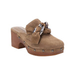 Il Sabot firmato Carmela, realizzato in camoscio è caratterizzato da una catena argento e da interno e sottopiede foderati in morbida pelle, questo modello incarna semplicità, eleganza e qualità.