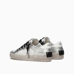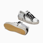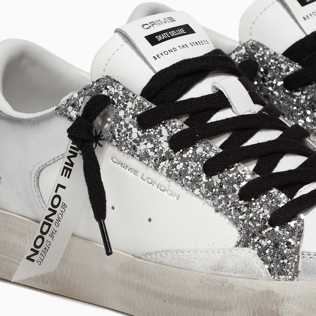 Tomaia in pelle bianca con profili argento laminati, tallone bianco, dettagli in silver glitter e suede off white