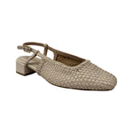 La Chanelle firmata Carmela, realizzata in pelle ghiaccio è caratterizzata da una lavorazione intrecciata e da una punta squadrata di tendenza, presenta un morbido plantare in pelle e un tacchetto di 3,5cm