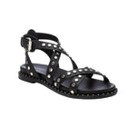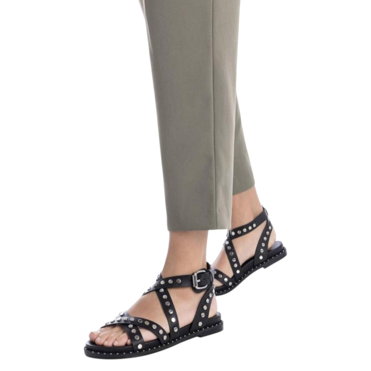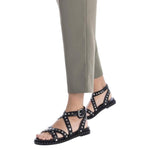 Il Sandalo firmato Carmela, realizzato in pelle nera è caratterizzato da un design con cinturino incrociato decorato con borchie metalliche, e da soletta ammortizzata e suola flessibile assicurano il massimo comfort.