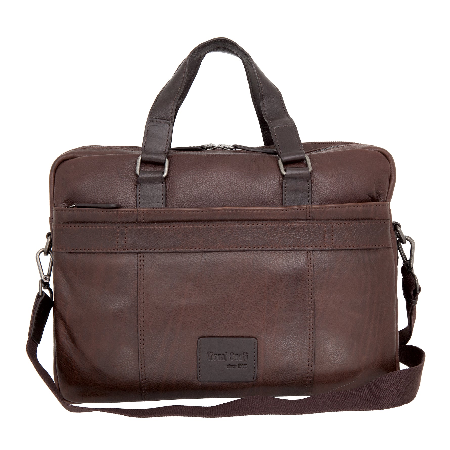 La Borsa da lavoro firmata Gianni Conti, realizzata in pelle è composta da due sezioni, entrambe chiuse con cerniera a doppio cursore. All'interno c'è uno scomparto per laptop fino a 15 pollici con strappo, una tasca con cerniera, all'esterno sul davanti c'è una tasca con bottone magnetico, all'interno c'è una tasca con cerniera e fissaggio alla maniglia di un valigia per un facile trasporto. Dotata di tracolla removibile e regolabile con moschettoni.
