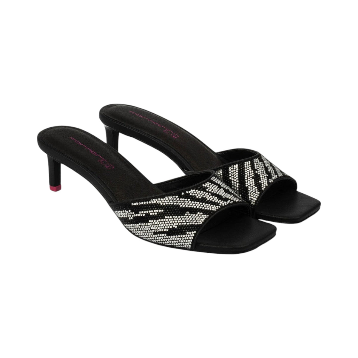 Lo Scalzato firmato Fornarina della linea Kelly, è il mules perfetto per accompagnarti nelle serate estive di festa. Total black, kitten heels, sottotacco fucsia e una cascata di strass argento e neri che sormontano la tomaia.