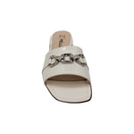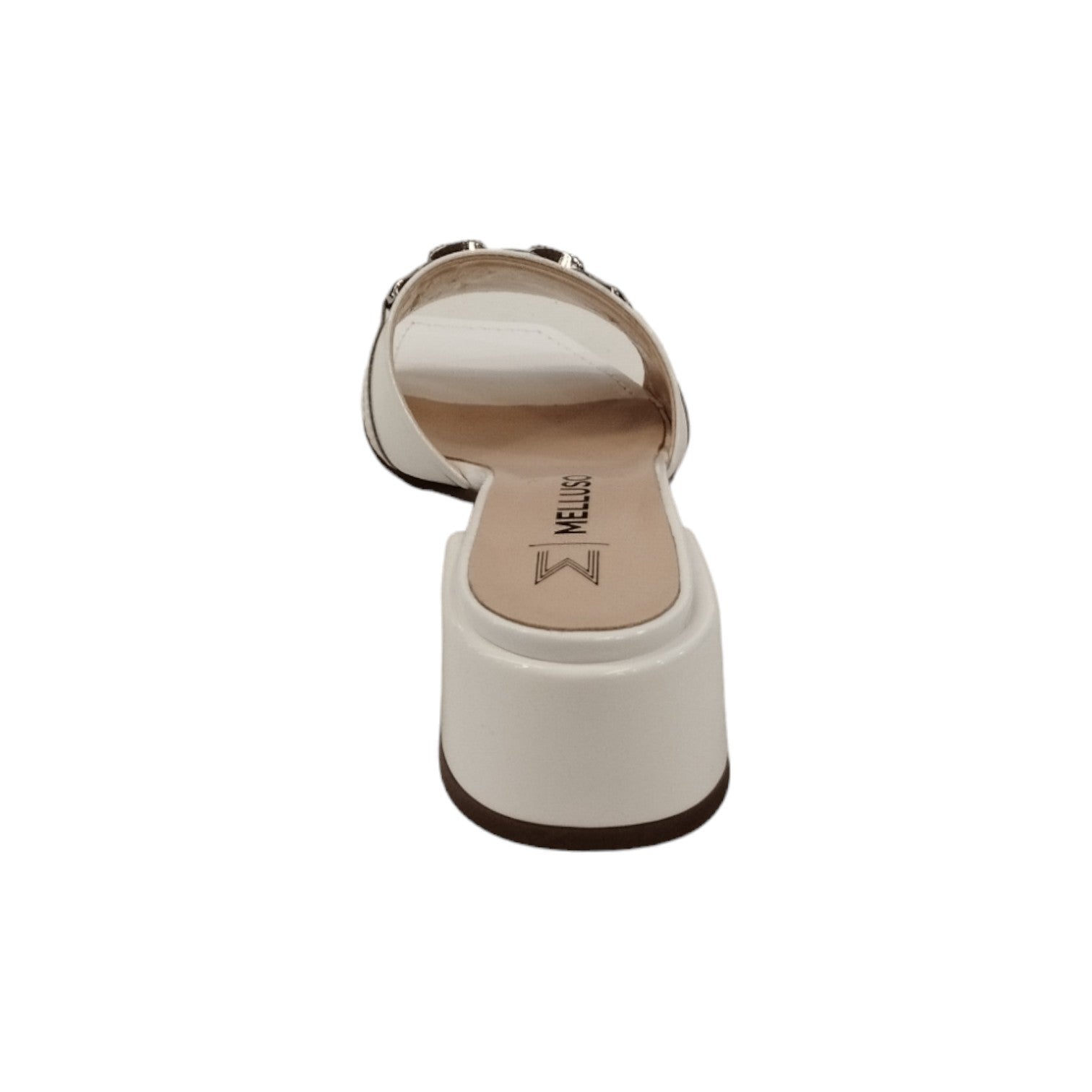 La Ciabattina firmata Melluso, realizzata in Vernice con struttura formata da un'unica fascia bianca impreziosita dall'accessorio con catena. Modello con tacco ricoperto con suola leggermente squadrata e presenta un sottopiede in memory foam e fodera in pelle.