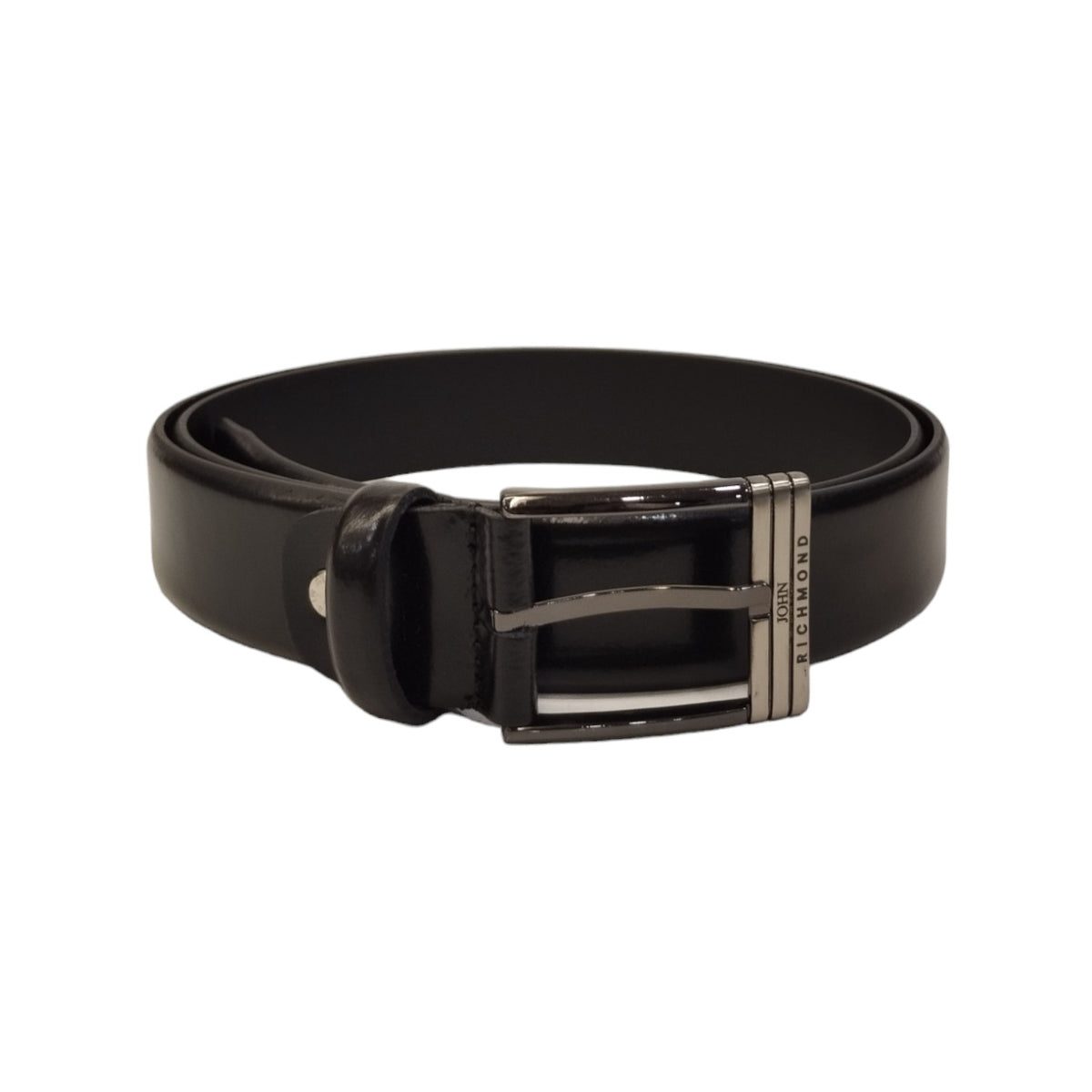 La Cintura firmata John Richmond, modello casual realizzata in pelle nera semilucida presenta una fibbia metallica in acciaio rettangolare con logo.