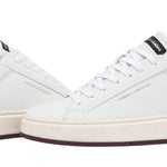 La Sneakers firmata Crime London, realizzata con tomaia in pelle bianca è caratterizzata da linguetta sul tallone in nabuk bordeaux e da linguetta in pelle bianca con etichetta in pelle con marchio. Presenta dei lacci di cotone bianco e fodera in pelle e tessuto.