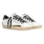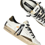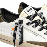 La Sneakers firmata Crime London, realizzata con tomaia in pelle bianca, dettagli in suede verde oliva è caratterizzata da tacco in nabuk verde oliva e linguetta in tessuto avorio con etichetta con logo in pelle, presenta toppa in pelle nera sul retro e suola in similpelle rivestita in avorio, fondo miele scuro.