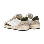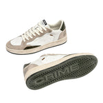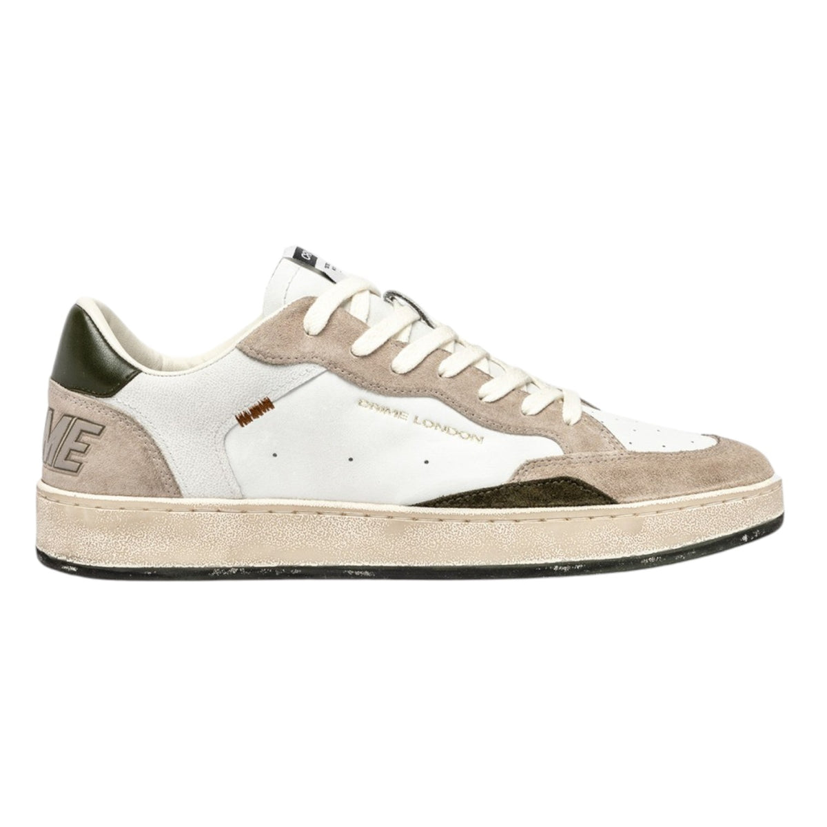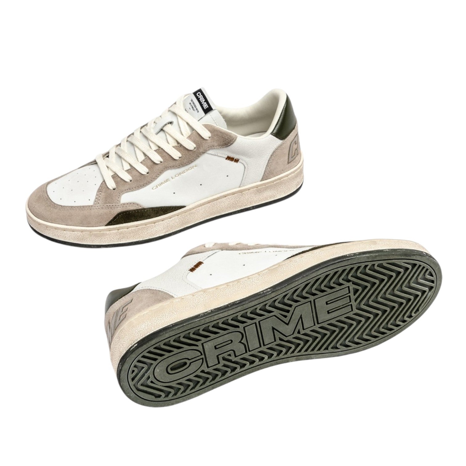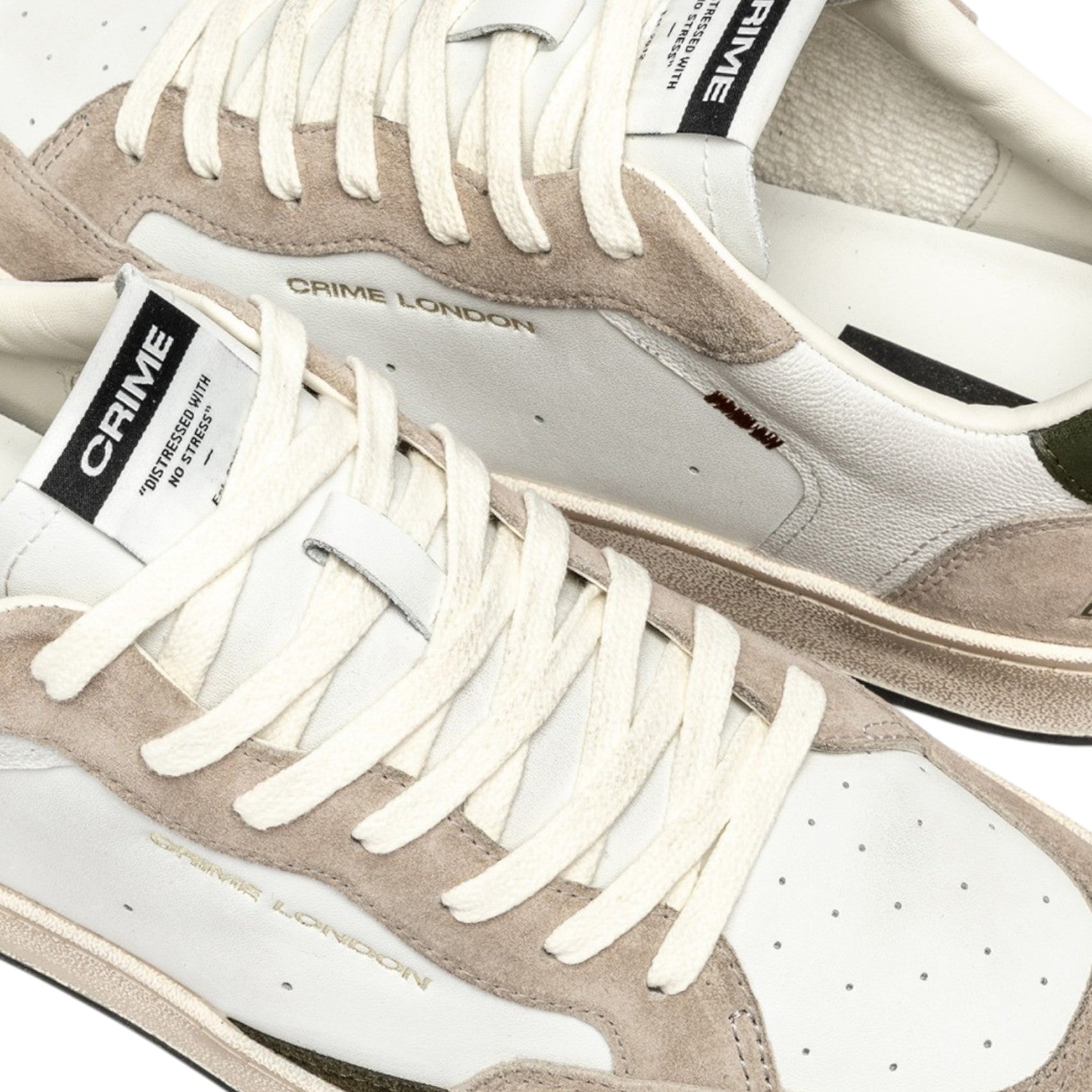 La Sneakers firmata Crime London, realizzata con tomaia in pelle bianca, dettagli in pelle scamosciata color tortora è caratterizzata da linguetta sul tallone in pelle verde scuro e da tacco in camoscio tortora con logo CRIME. Dispone di linguetta in pelle bianca con etichetta in tessuto logato e lacci in cotone avorio.