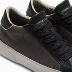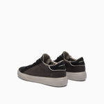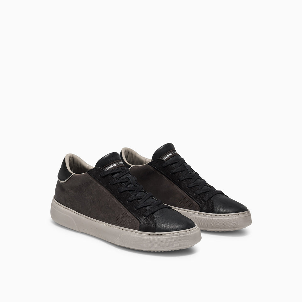 Sneaker firmata Crime London realizzata con tomaia in baby calf, leather dark brown tinta al naturale con tallone in pelle nera e dettagli in nubuk. Linguetta nera con label logata dark brown.
