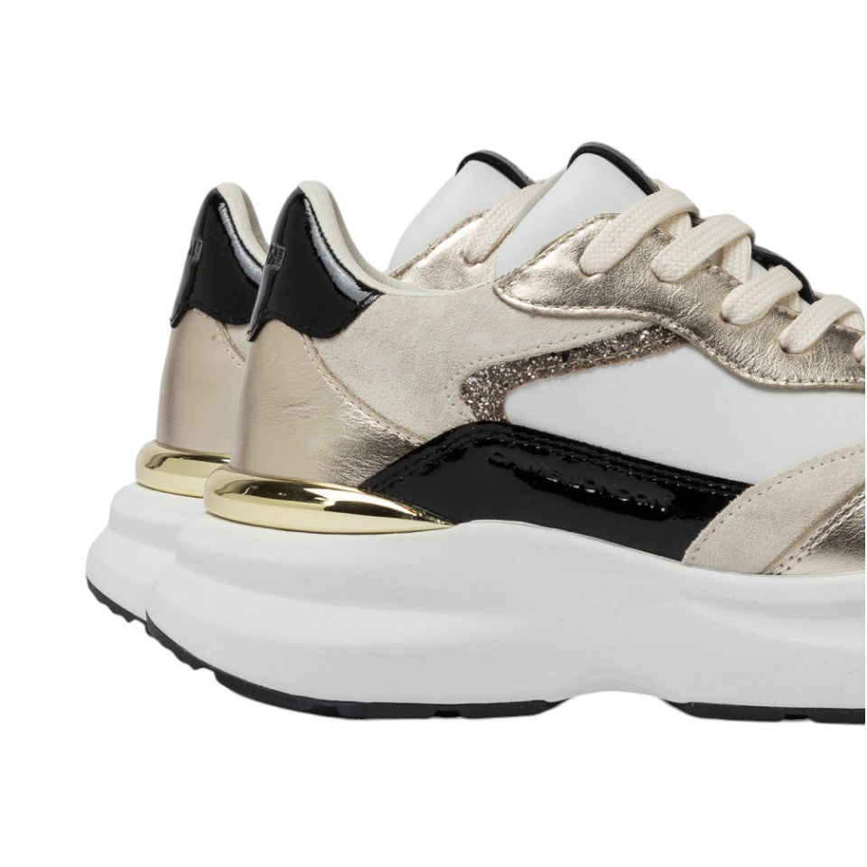 La Sneakers firmata Crime London, realizzata con tomaia in pelle bianca con pelle laminata platino e glitter oro, dettagli in vernice nera è caratterizzata da linguetta sul tallone in vernice nera e da stabilizzatore in gomma dorata. Inoltre, dispone di lacci di marshmallow e di suola in gomma bianca, fondo nero.