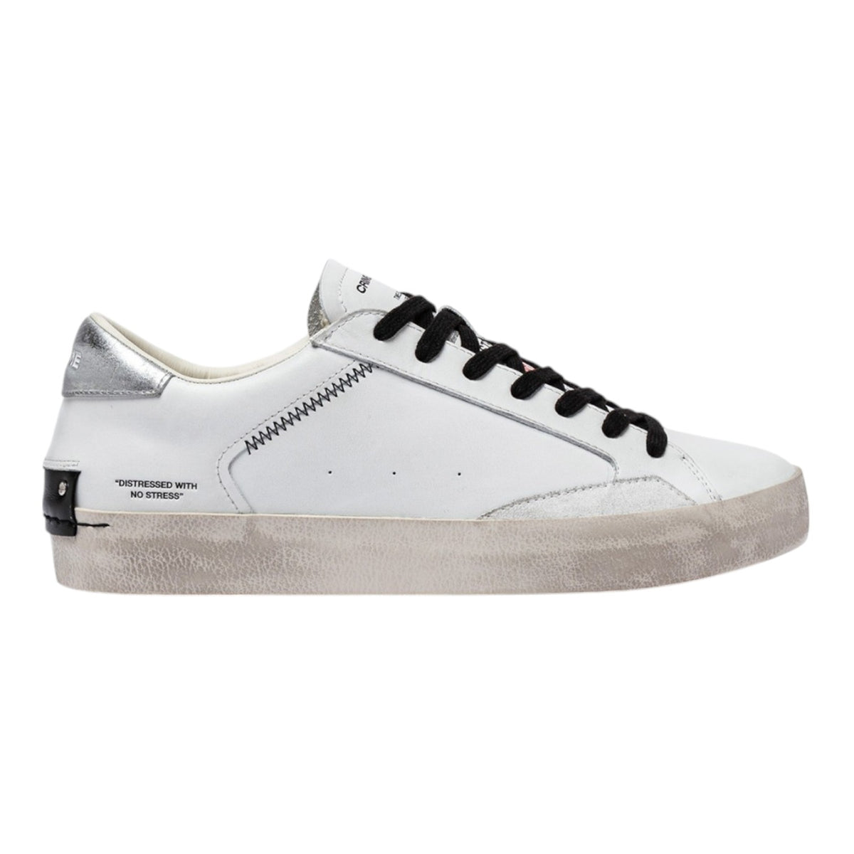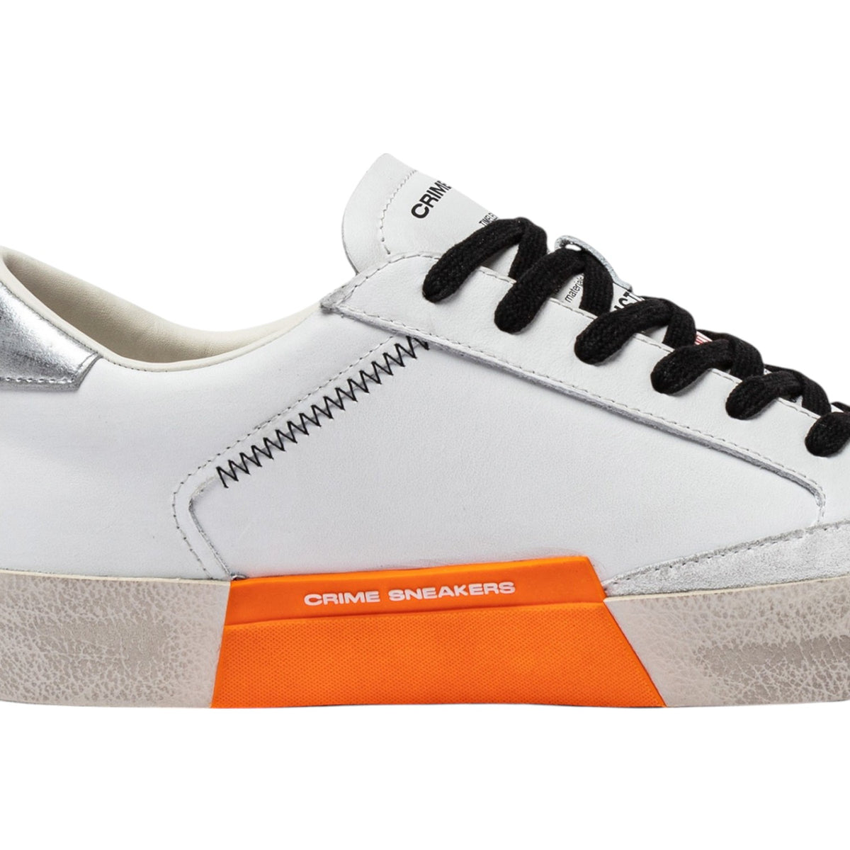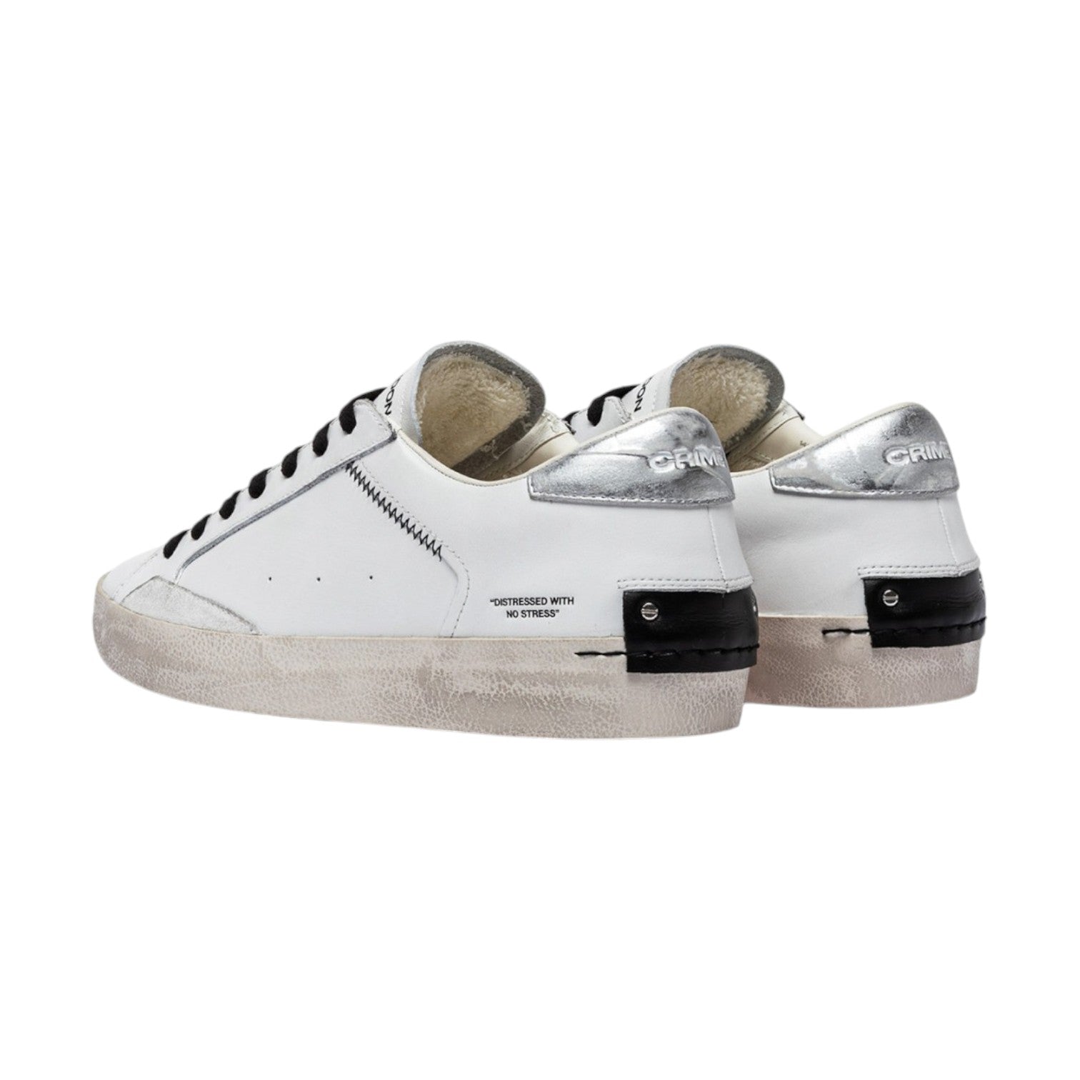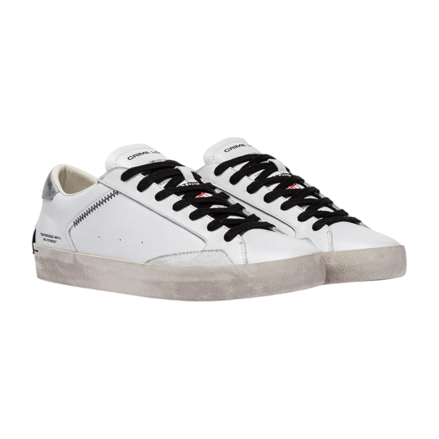 La Sneakers firmata Crime London, realizzata con tomaia in pelle bianca, dettagli in suede bianco è caratterizzata da talloncino in suede spalmato argento e da linguetta in pelle bianca, inoltre dispone di patch in pelle nera sul retro e lacci neri in cotone.