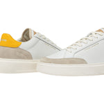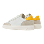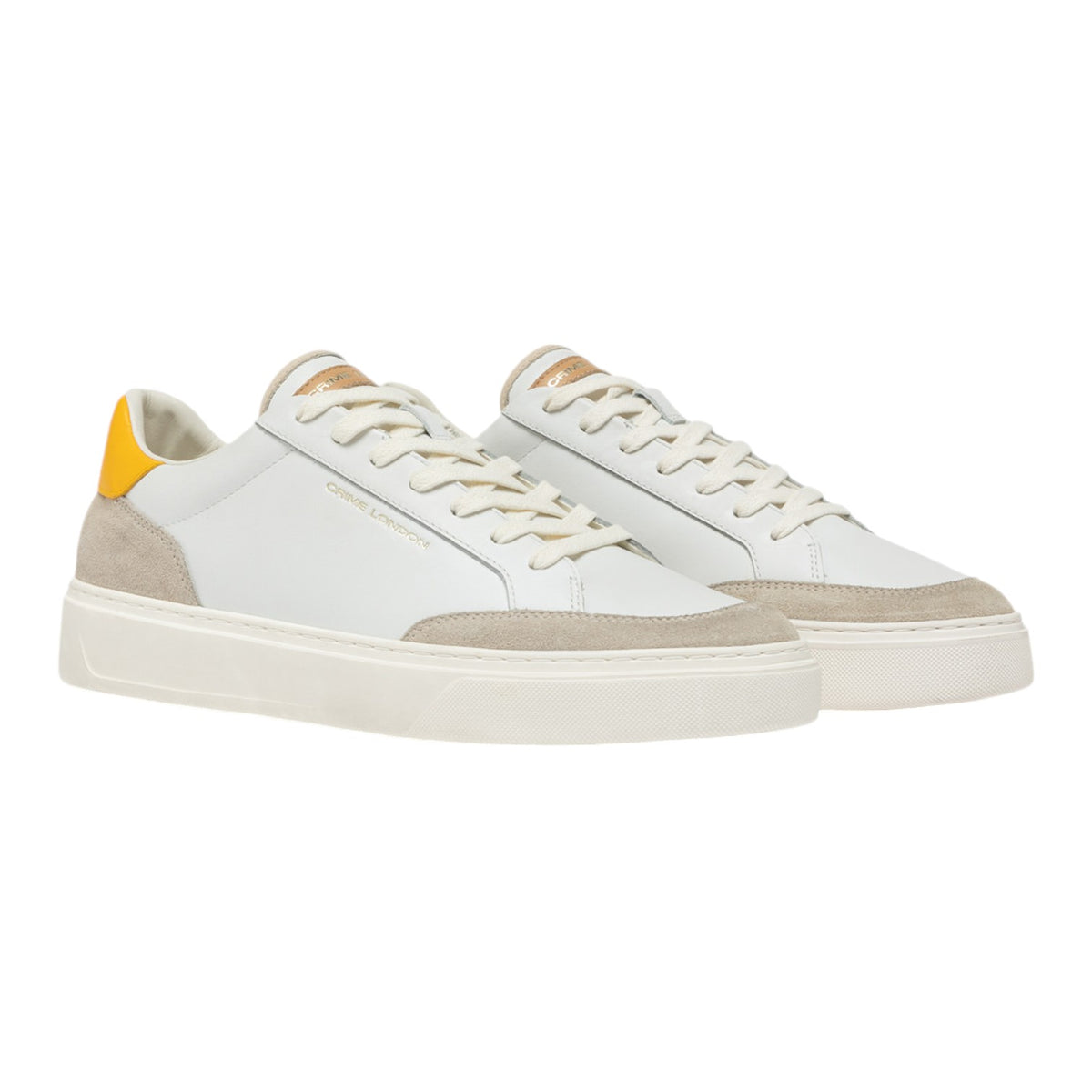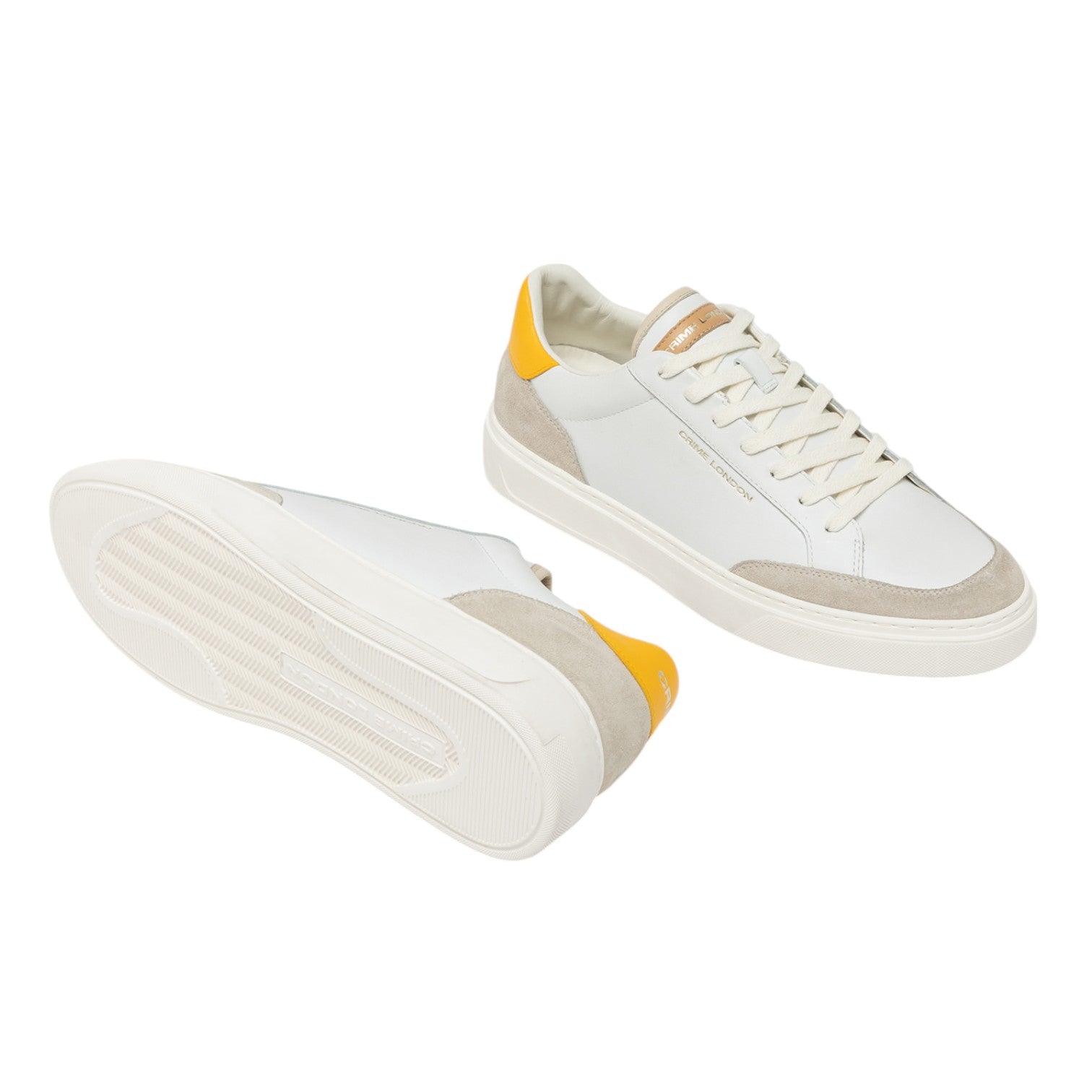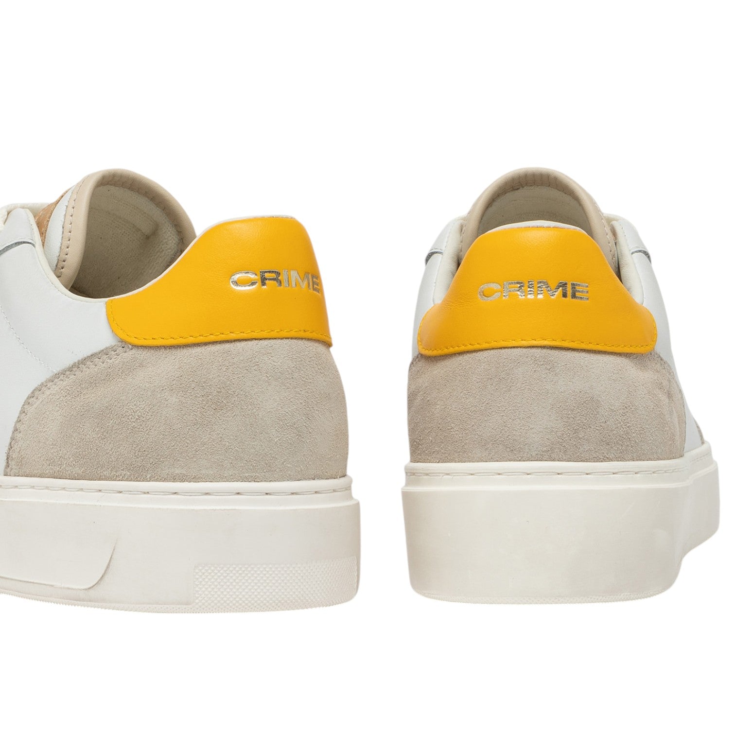 La Sneakers firmata Crime London, realizzata con tomaia in pelle bianca con tallone in nappa gialla e dettagli in pelle scamosciata beige è caratterizzata da linguetta con etichetta Crime in pelle marrone, inoltre dispone suola MK Light avorio con profilo lineare