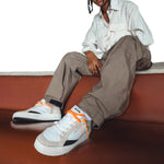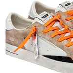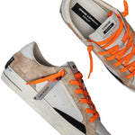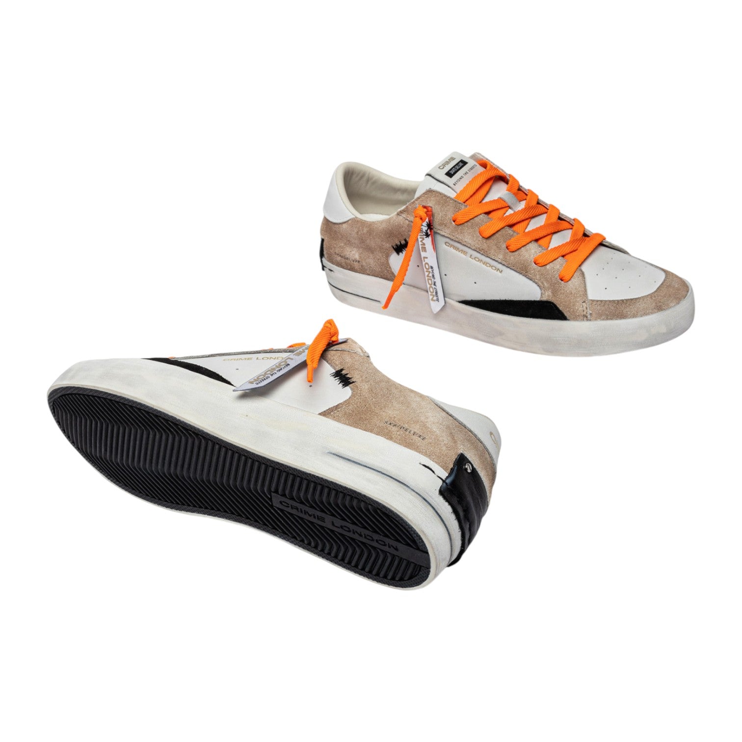 La Sneakers firmata Crime London, realizzata con tomaia in suede sabbia con stampa interna, dettagli in suede nero è' caratterizzata da linguetta sul tallone in pelle bianca e da linguetta in pelle bianca con etichetta in pelle con logo. Presenta una toppa in pelle nera sul retro e doppio pizzo arancione fluo e bianco, con etichetta singola con effetto specchio argentato.