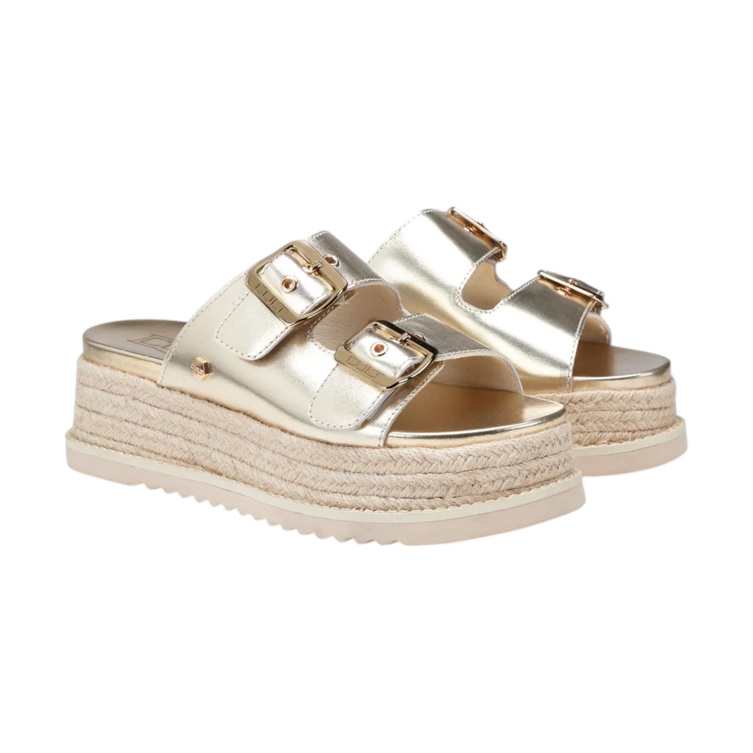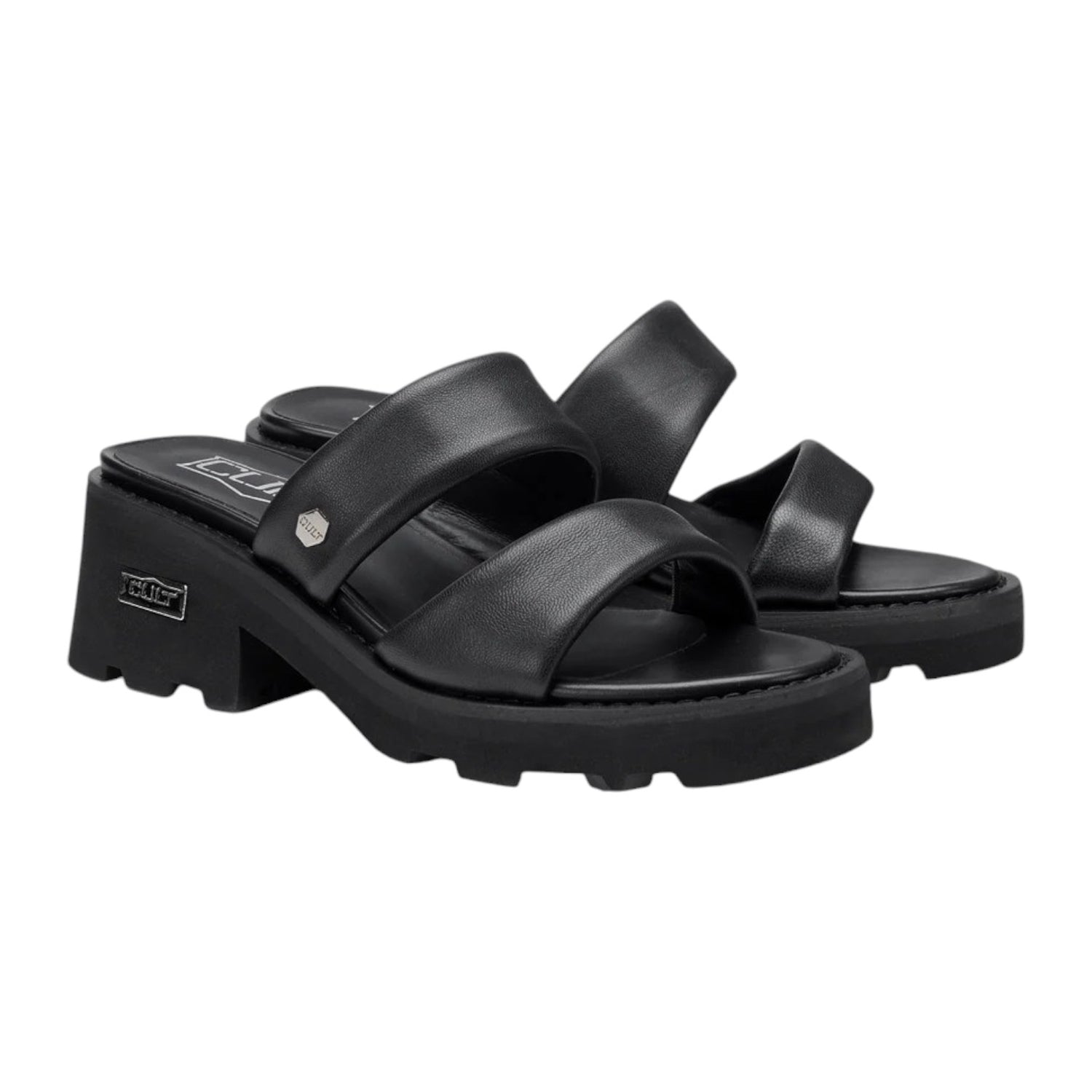 Lo Scalzato firmato Cult, realizzato in pelle nera per infondere una nuova sicurezza ai look femminili. Il modello ha un appeal esuberante con plateau alto, un robusto tacco a blocco e borchie sferiche color oro che amplificano lo stile audace del brand. Altezza tacco 12cm.