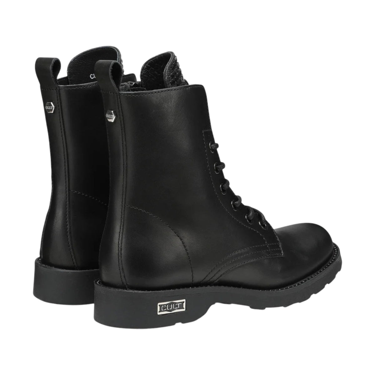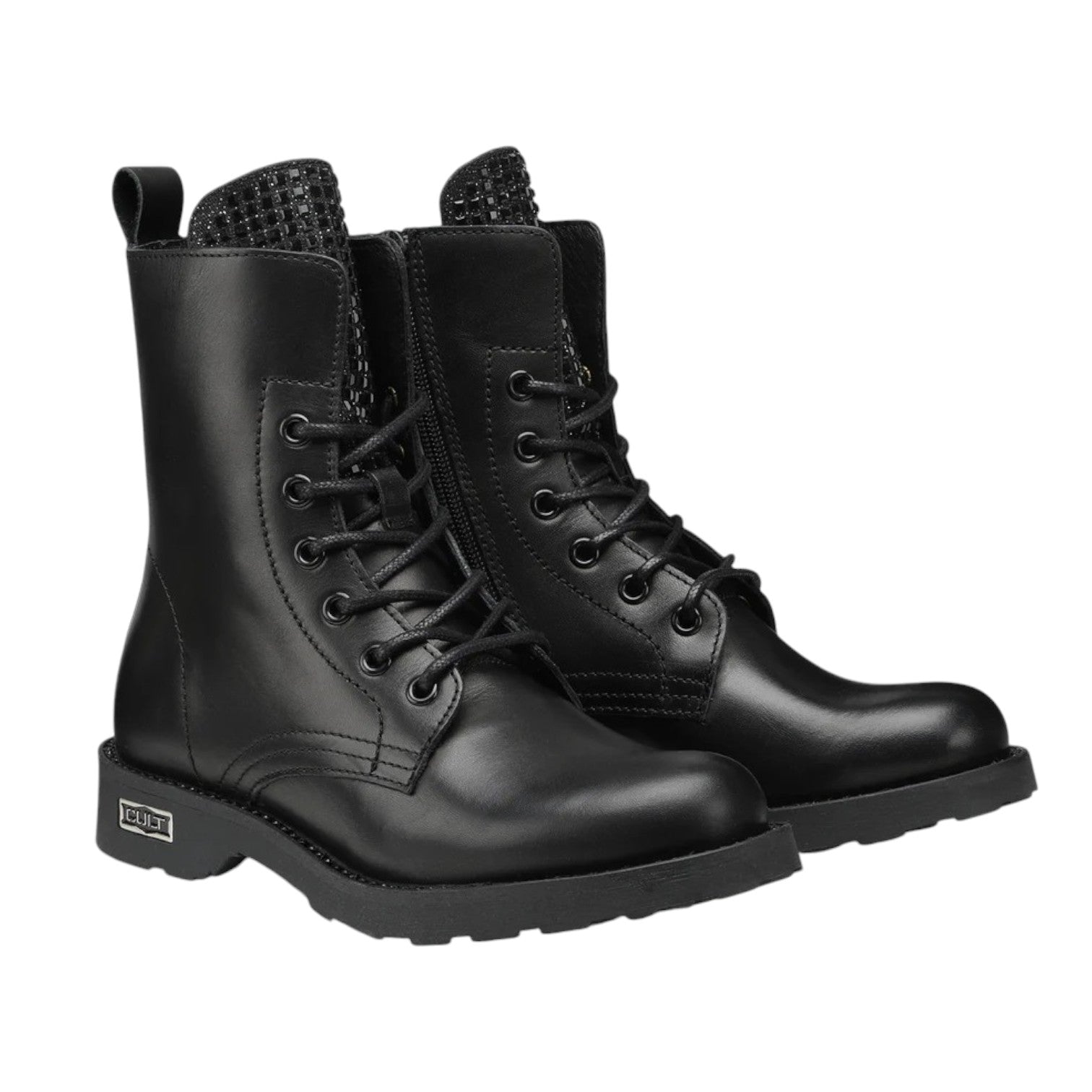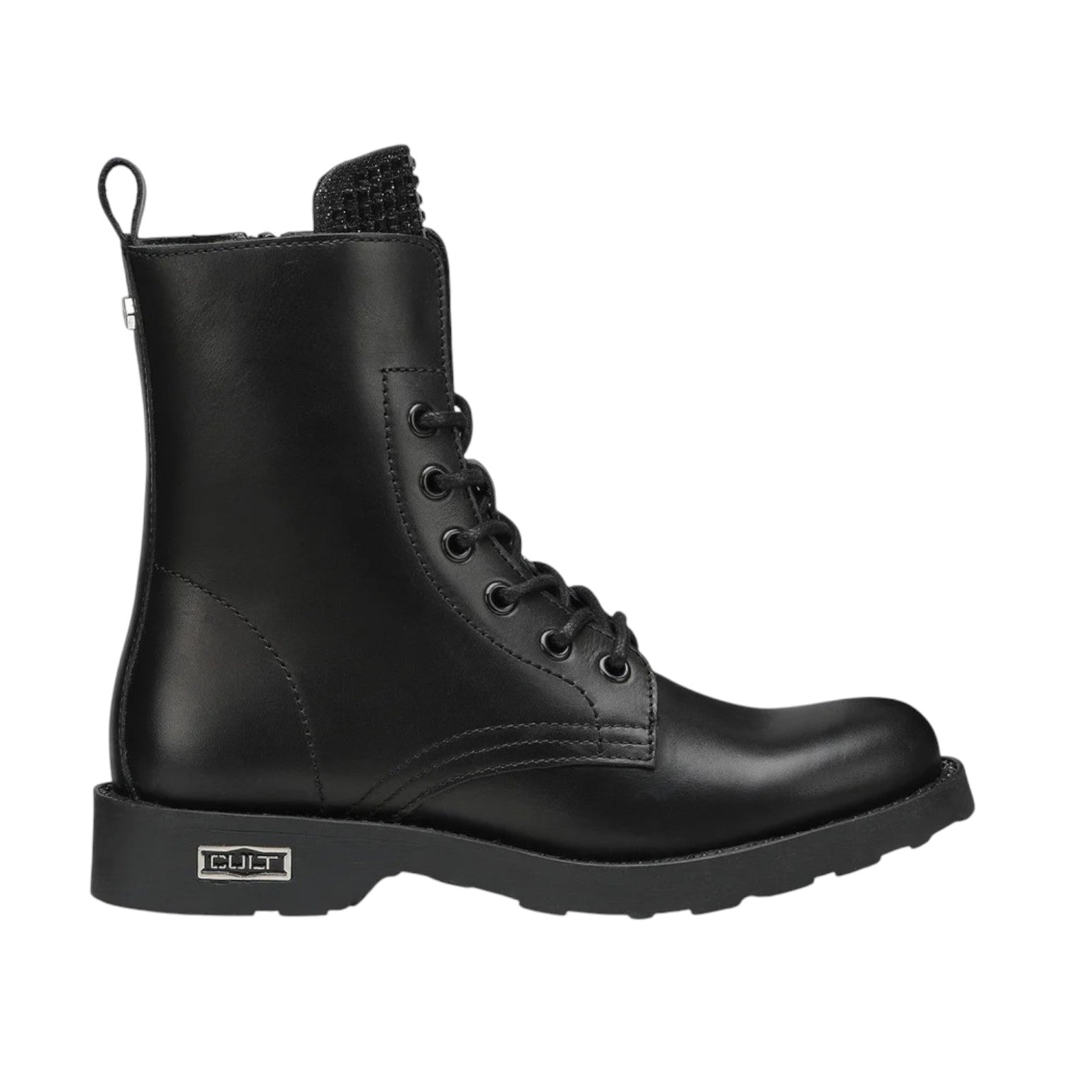 L'Anfibio firmato Cult, realizzato in pelle nera un modello intramontabile di stivaletti è caratterizzato da applicazione di strass sulla linguetta, con occhielli in metallo, targhetta con logo sulla suola di gomma e tirante posteriore. Da indossare con jeans, pantaloni o gonne corte.