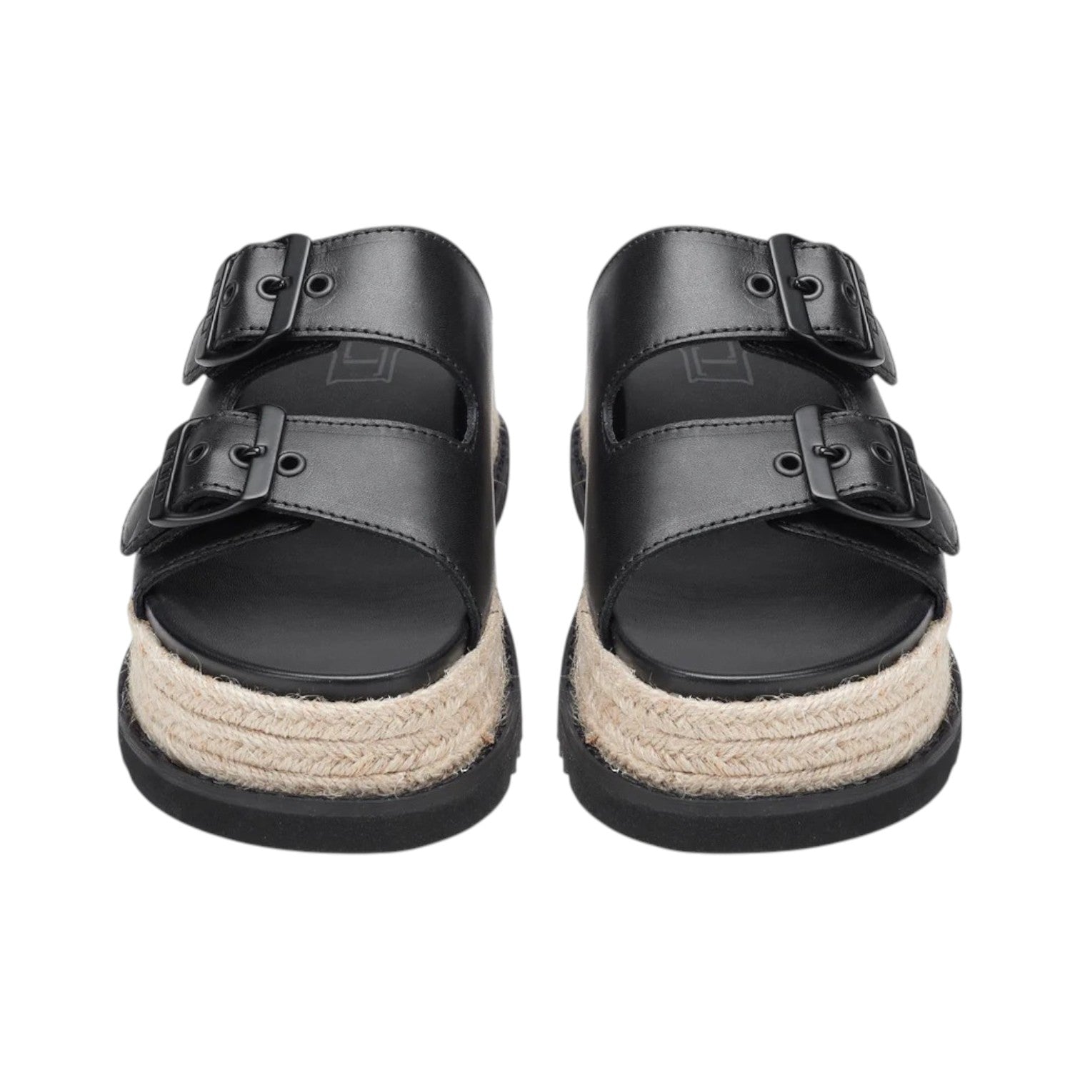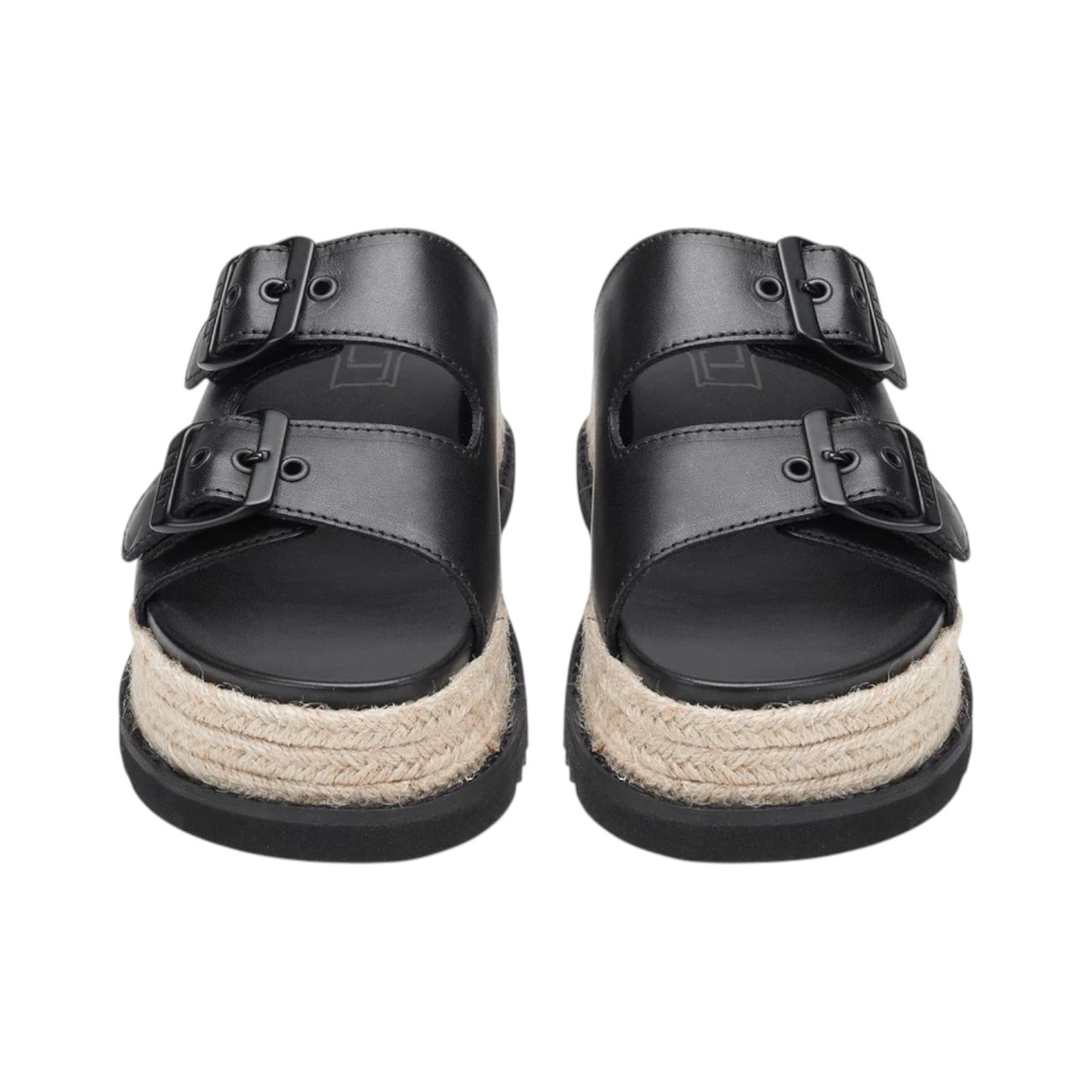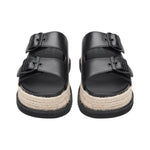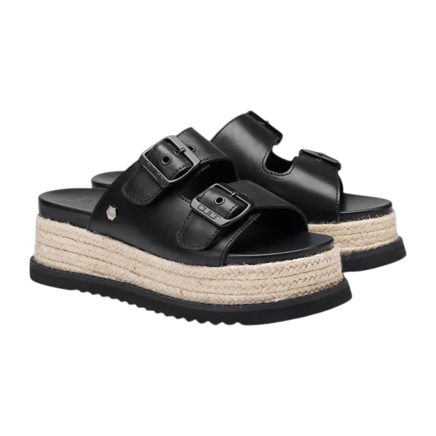 La Ciabatta firmata Cult, combina pelle nera e fibbie tono su tono per un tocco glam-rock. La zeppa in corda intrecciata, ispirata all’espadrillas, richiama uno stile prettamente estivo, mentre la suola nera aggiunge contrasto e carattere. Perfetto per un look casual-chic da giorno a sera.