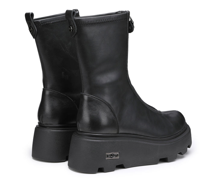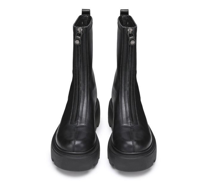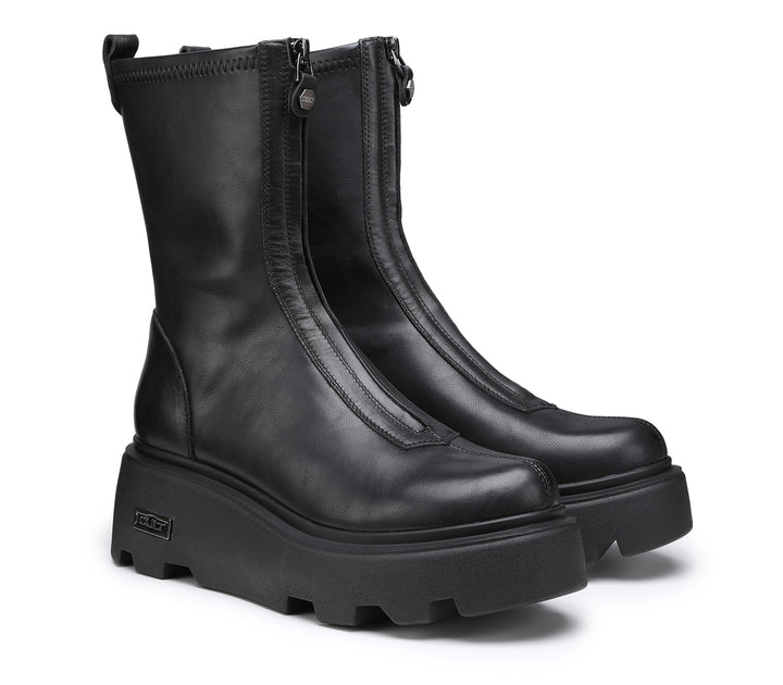 Lo Stivaletto firmato Cult, realizzato in pelle con punta rinforzata è impreziosito da una zip nella parte centrale del gambale, con un plateau alto 6cm che dona forza alla scarpa.