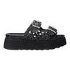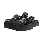 Lo Scalzato firmato Cult, questo nuovo modello Janis diventerà un vero e proprio must-have. Due fasce in pelle nera con lavorazione intrecciata impreziosite da fibbie in metallo con logo Cult inciso e suola platform per questi sandali da abbinare a ogni outfit per un look decisamente glam rock.