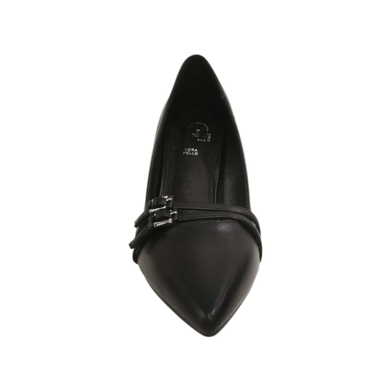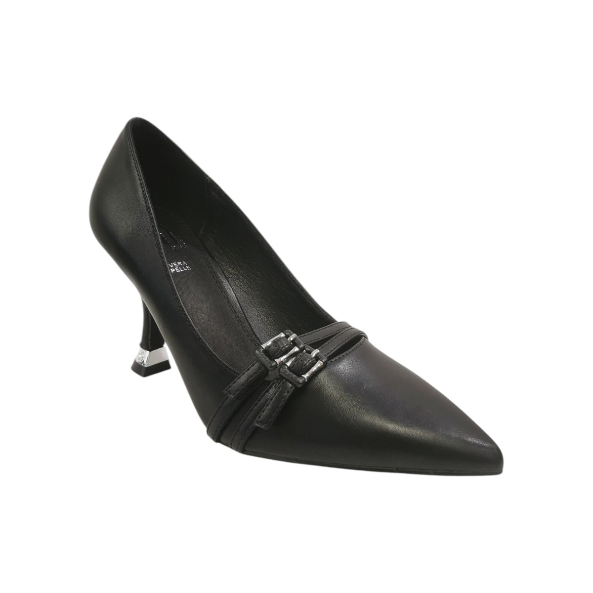Il Dècollettè firmato Gold&Gold, realizzato in ecopelle nella variante nera è caratterizzato da una punta sfilata e da cinturini con fibbietta, il plantare è rivestito in pelle molto morbido per un maggior comfort, e tacco a rocchetto alto 9cm che slancia la figura con inserto argento.