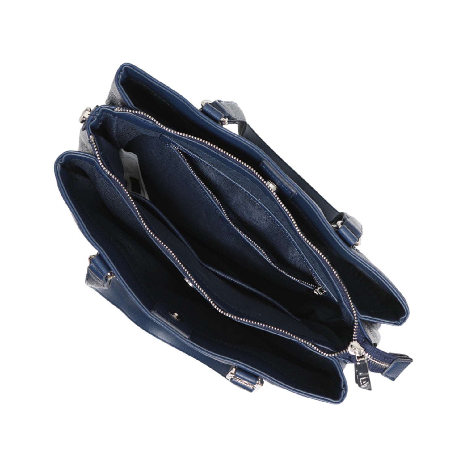 La Borsa a spalla firmata By Byblos, qui proposta nella variante blu realizzata in ecopelle, l'interno è foderato in tessuto di cui dispone di triplo scomparto di cui quello centrale chiuso con zip e gli altri due con bottone, ha una doppia portabilità: a spalla grazie ai manici oppure con doppia tracolla regolabile e removibile. Pensato per la donna dinamica che ama distinguersi con stile.