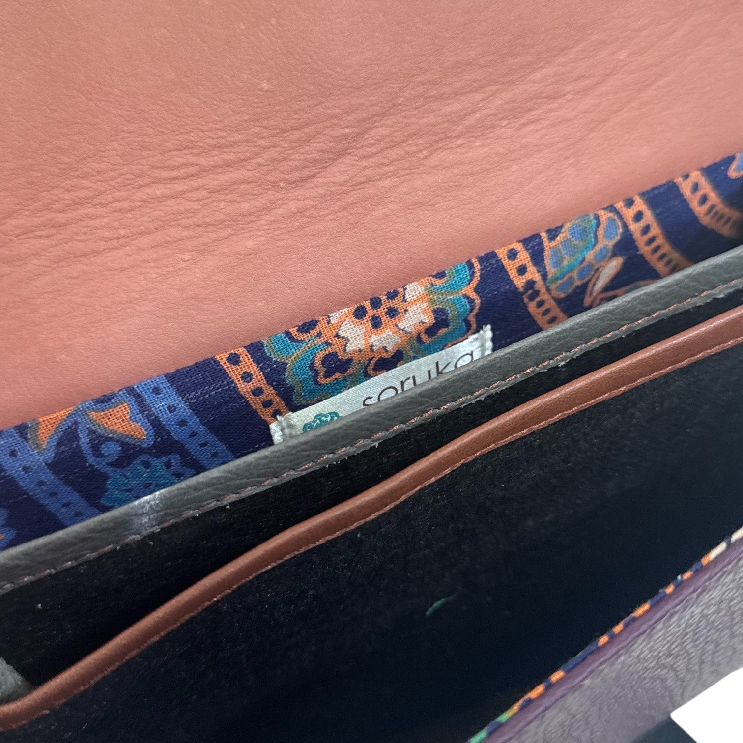 La Tracolla firmata Soruka, è caratterizzata da inserti multicolor dai colori scuri, presenta una forma arrotondata, una tracolla regolabile e l'interno è foderato in tessuto a fantasia con 3 scomparti e taschino con zip, modello a produzione “zero waste” equa e responsabile che utilizza gli scarti di pelle. Soruka è un progetto che trasforma scarti di pelle in accessori moda unici, sostenibili e fatti a mano.