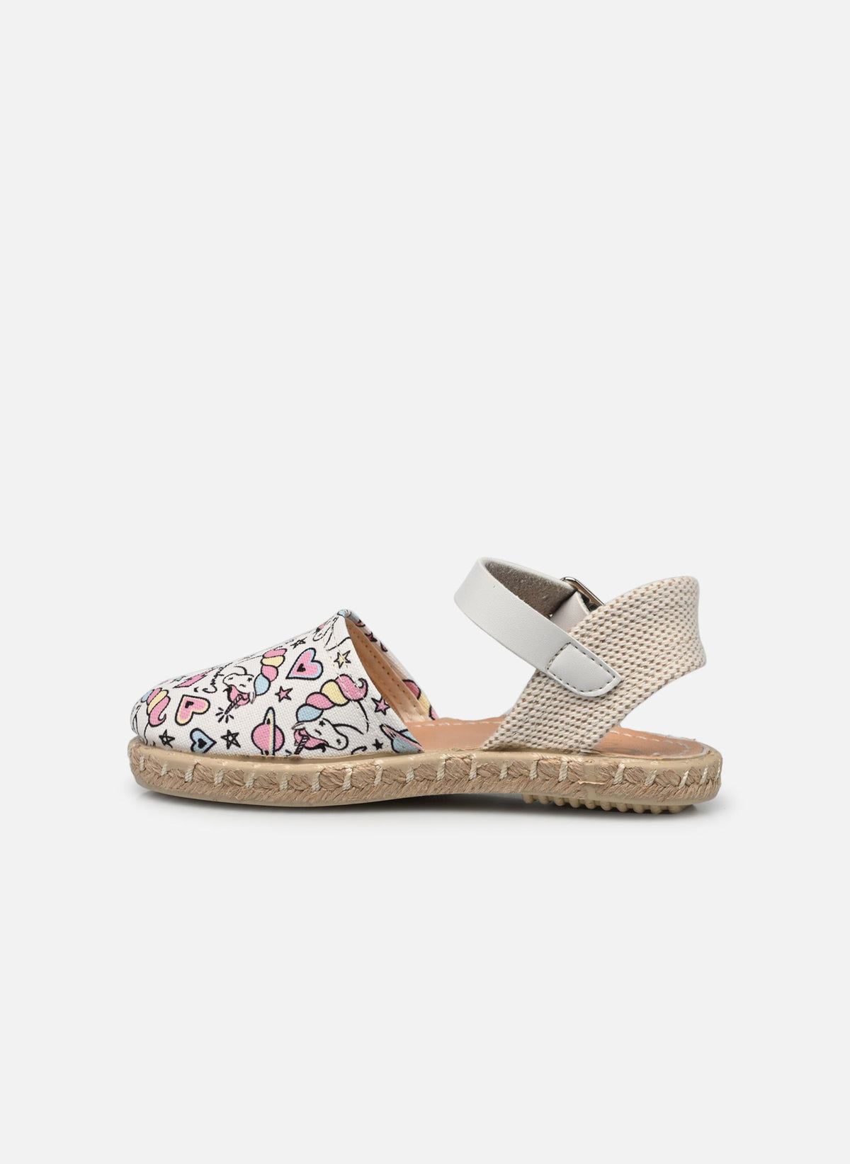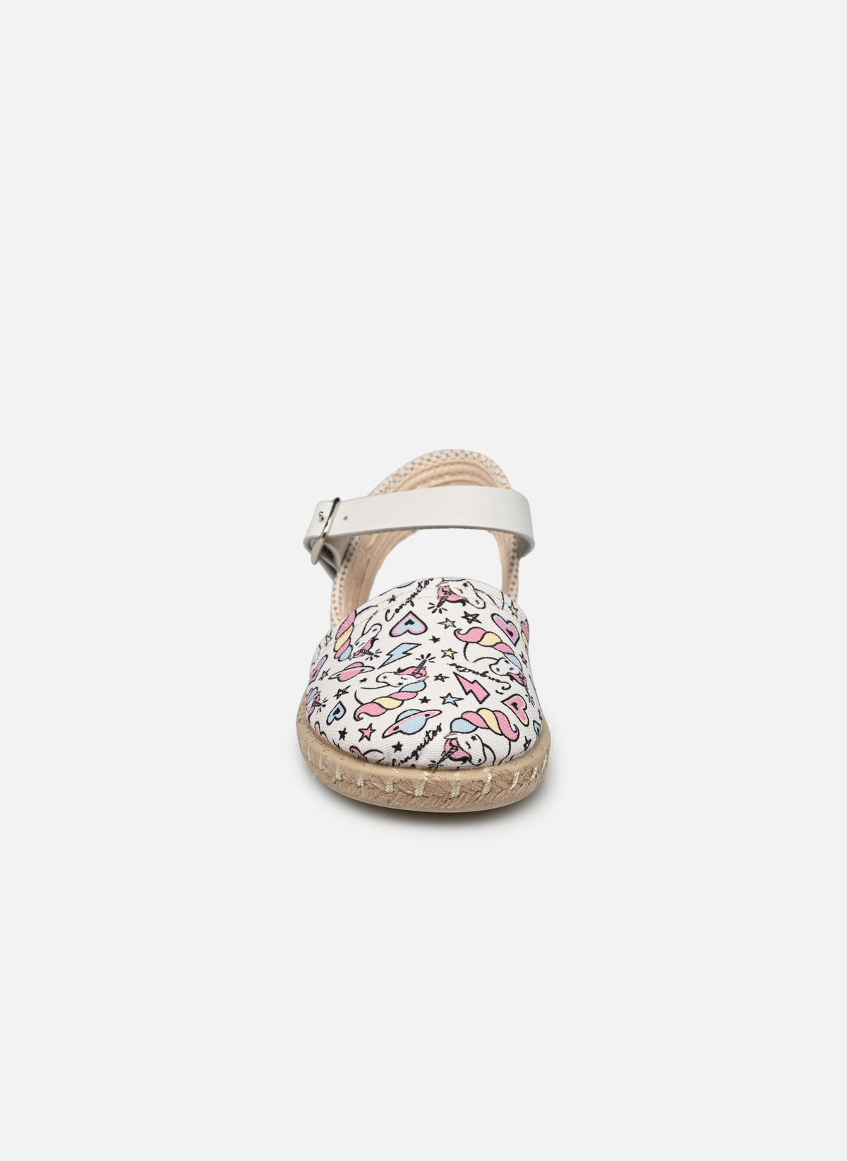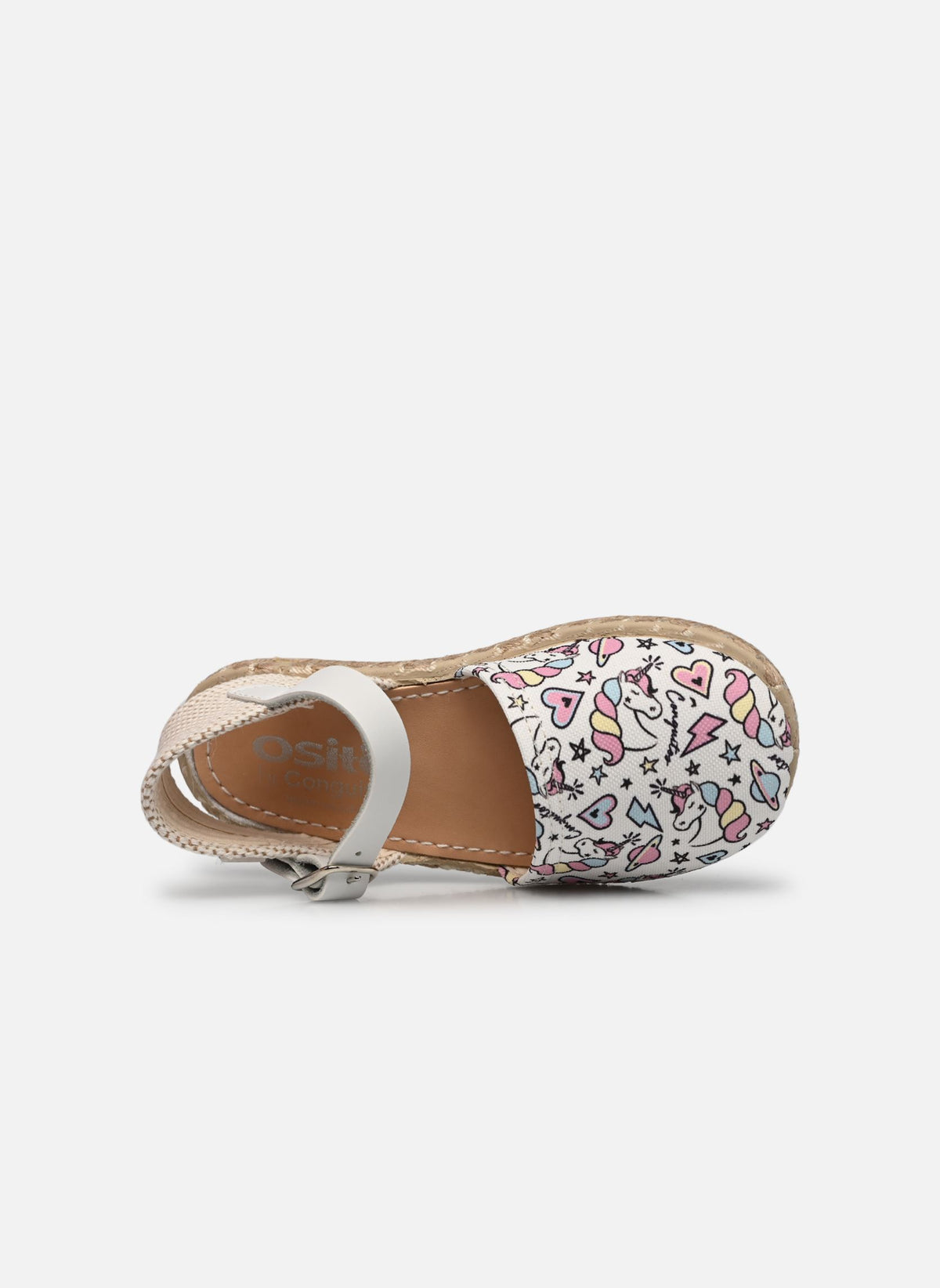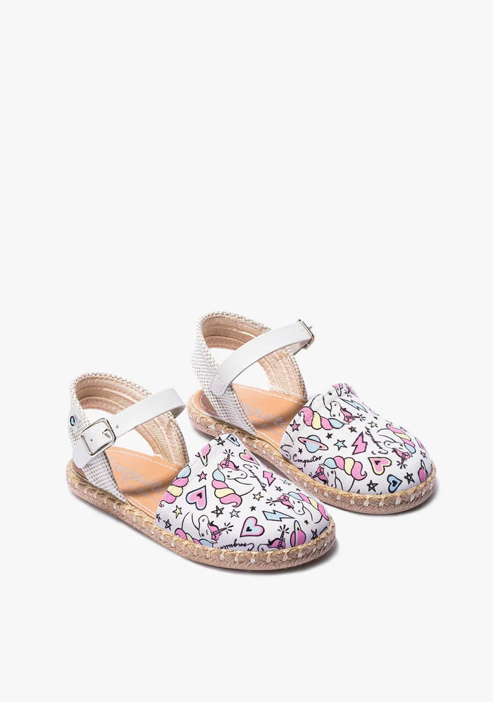 Espadrillas firmata Conguitos, disponibile nella versione bianca con stampa unicorno, realizzato in morbido tessuto presenta la suola in iuta con fondo gomma. Dotato di comoda chiusura a bracciale con fibbia in argento.