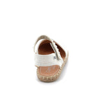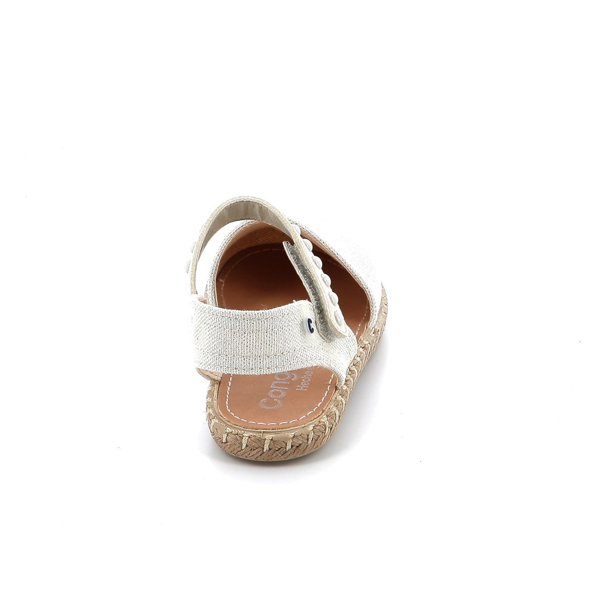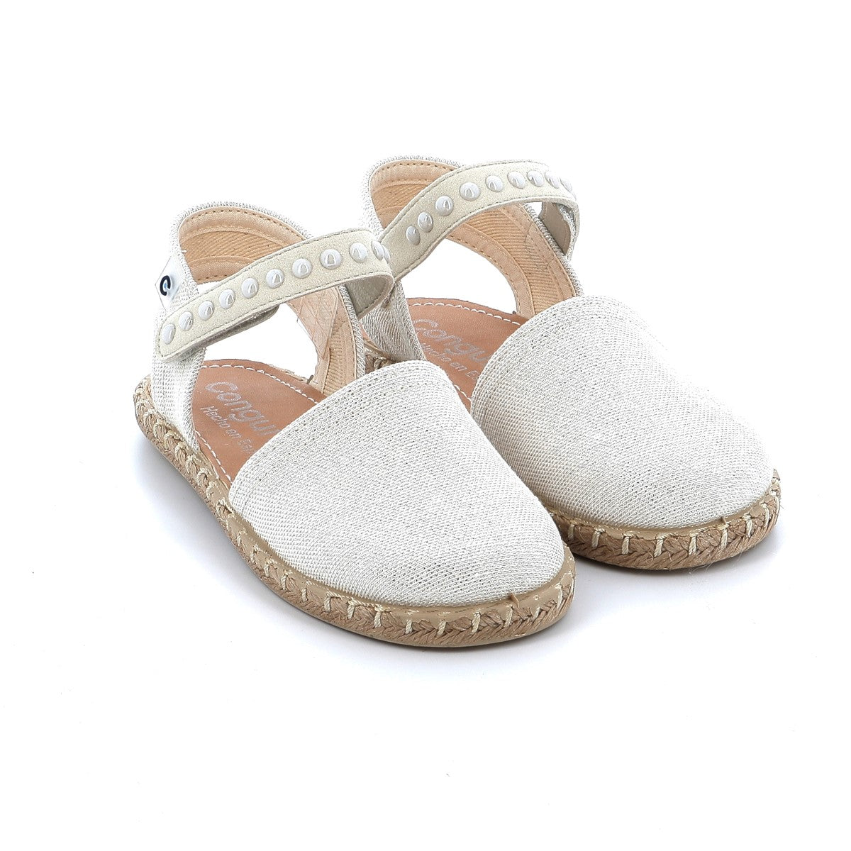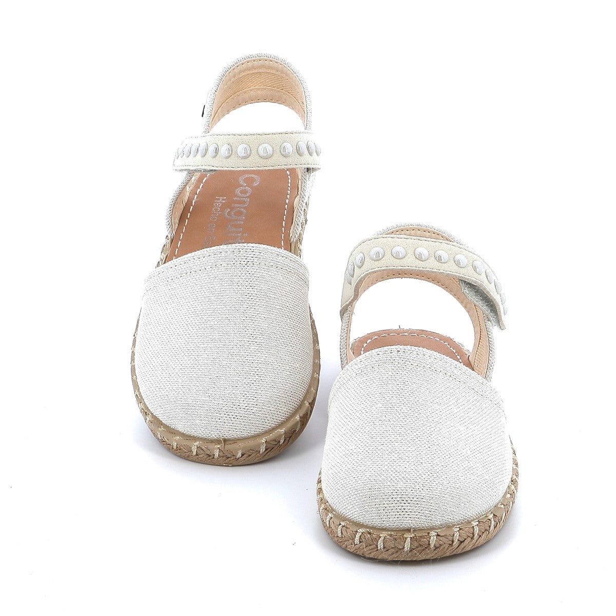 Espadrillas firmata Conguitos, disponibile nella variante beige, realizzato in morbido tessuto presenta la suola in iuta con fondo gomma. Dotato di comoda chiusura a strappo presenta delle mini perle bianche.