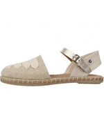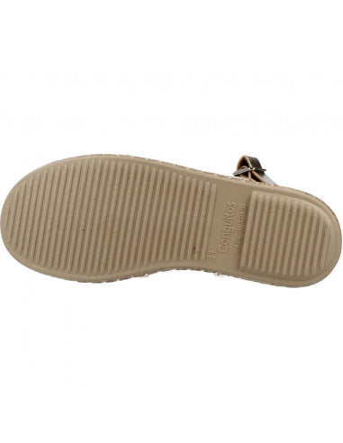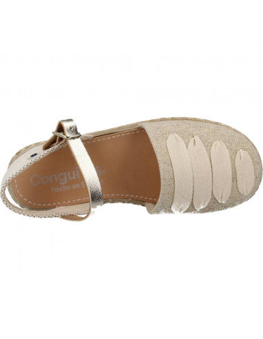 Espadrillas firmata Conguitos, disponibile nella variante beige con dettaglio fiocco sul davanti, realizzato in morbido tessuto presenta la suola in iuta con fondo gomma. Dotato di comoda chiusura con fibbia a bracciale dorato laminato.