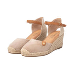 Espadrillas firmata Carmela, realizzato in camoscio è caratterizzata da dorso in tela e cinturino in pelle con fibbia per supporto alla caviglia, e da rivestimento interno in pelle con una comoda zeppa in corda alta 7cm e plateau di 1,5cm, e suola in gomma antiscivolo.