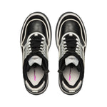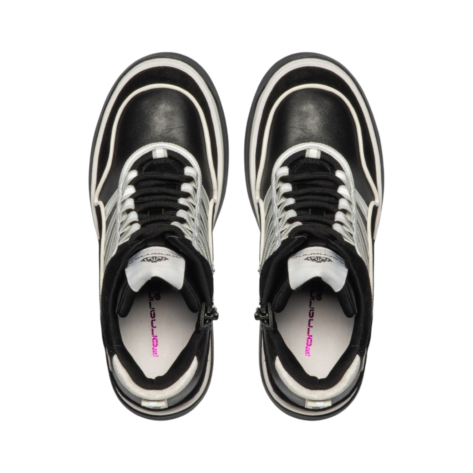 La Sneakers firmata Fornarina, realizzata in pelle e camoscio total black è caratterizzata da dettagli a contrasto, zeppa interna alta 8cm e allacciatura in stile pugile. Le sneakers high-top donano al look un perfetto twist urban.