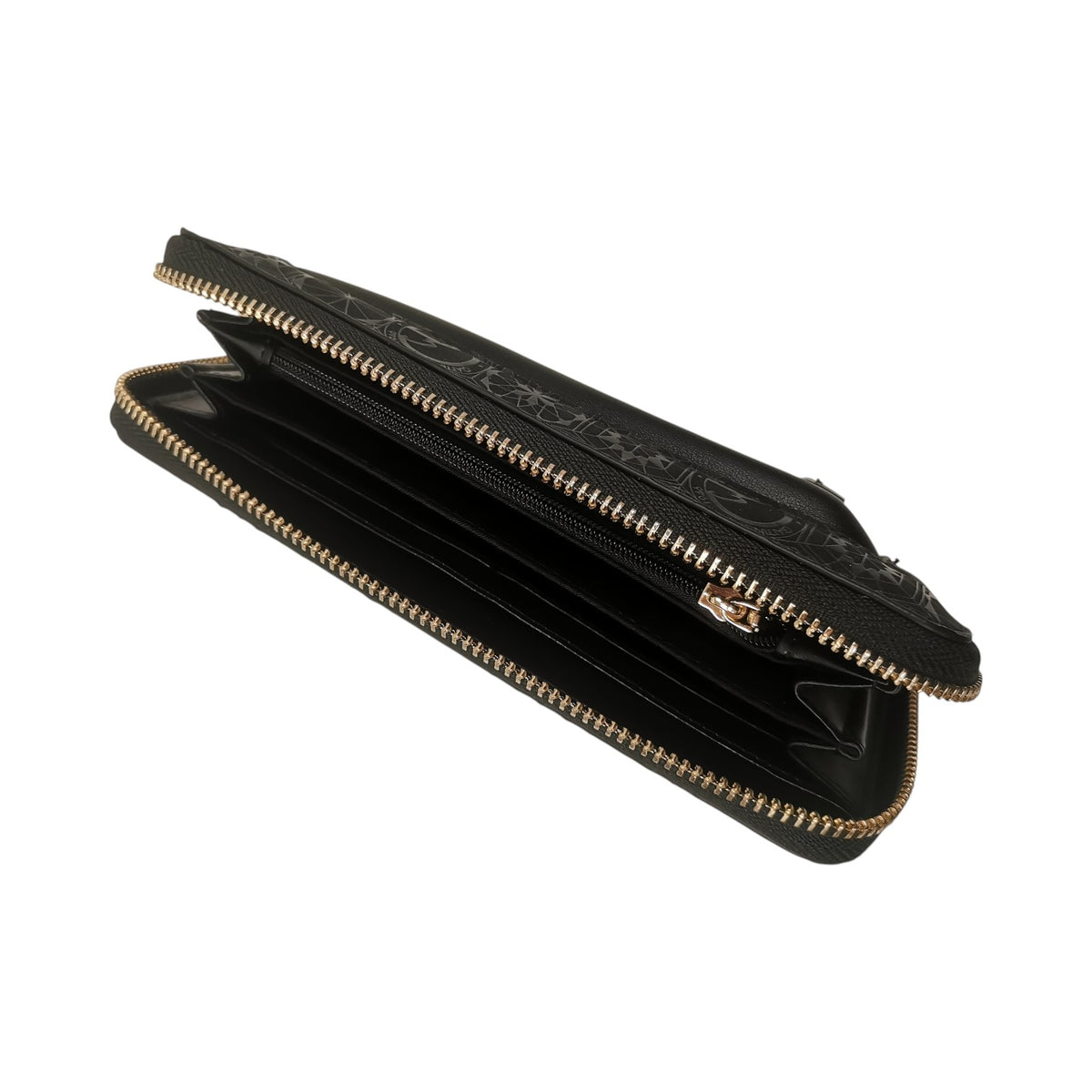 Il Portafoglio firmato Gattinoni Roma, realizzato in ecopelle nera è caratterizzato da stampa teodosia e da zip frontale, si apre con la zip di cui all'interno presenta scomparti per banconote, tessere e un taschino con zip per le monetine.