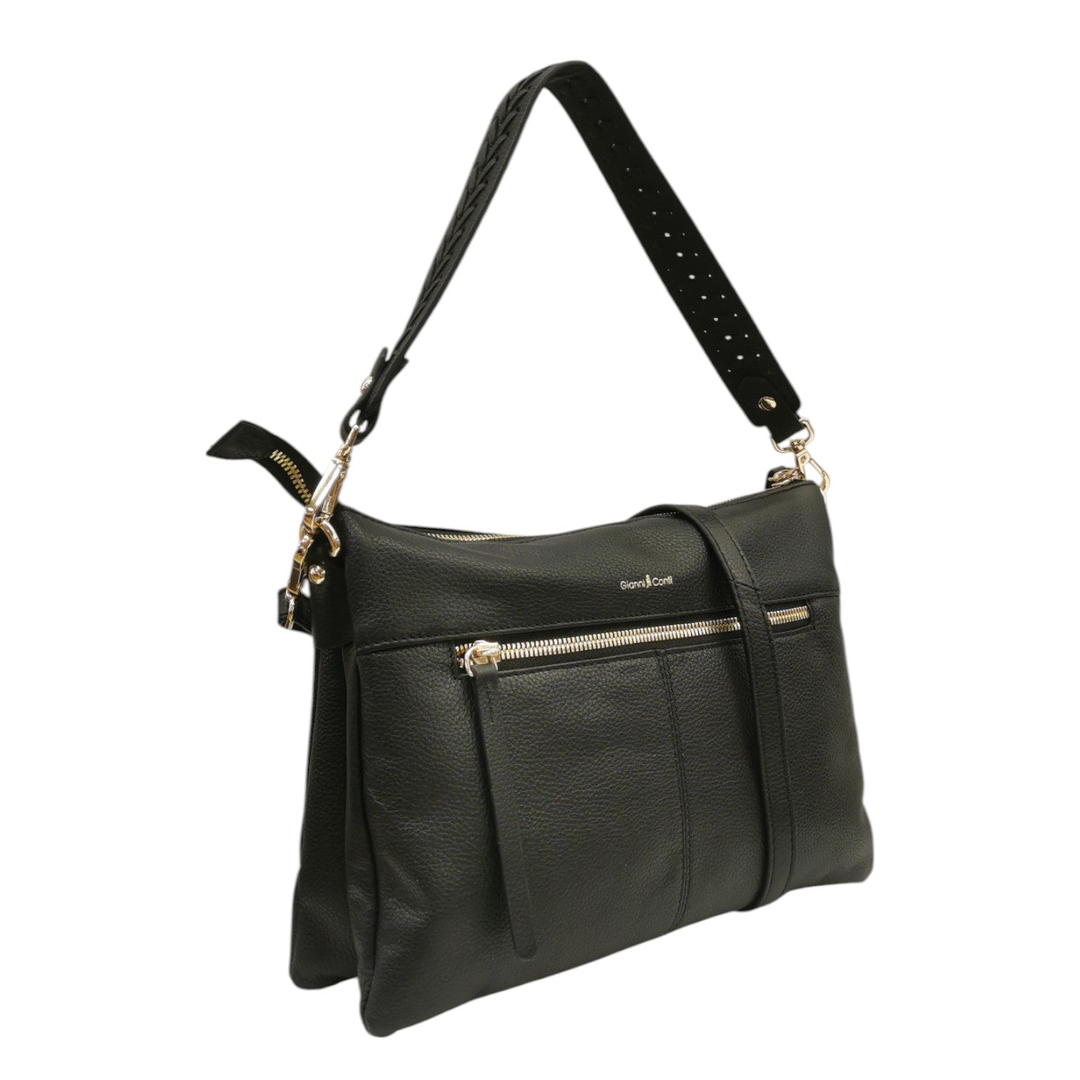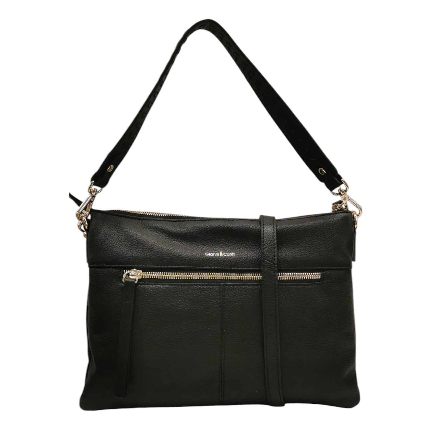 Gianni Conti Borsa a Spalla Donna in Pelle Nera a Due Soffietti con Tracolla e Zip Frontale