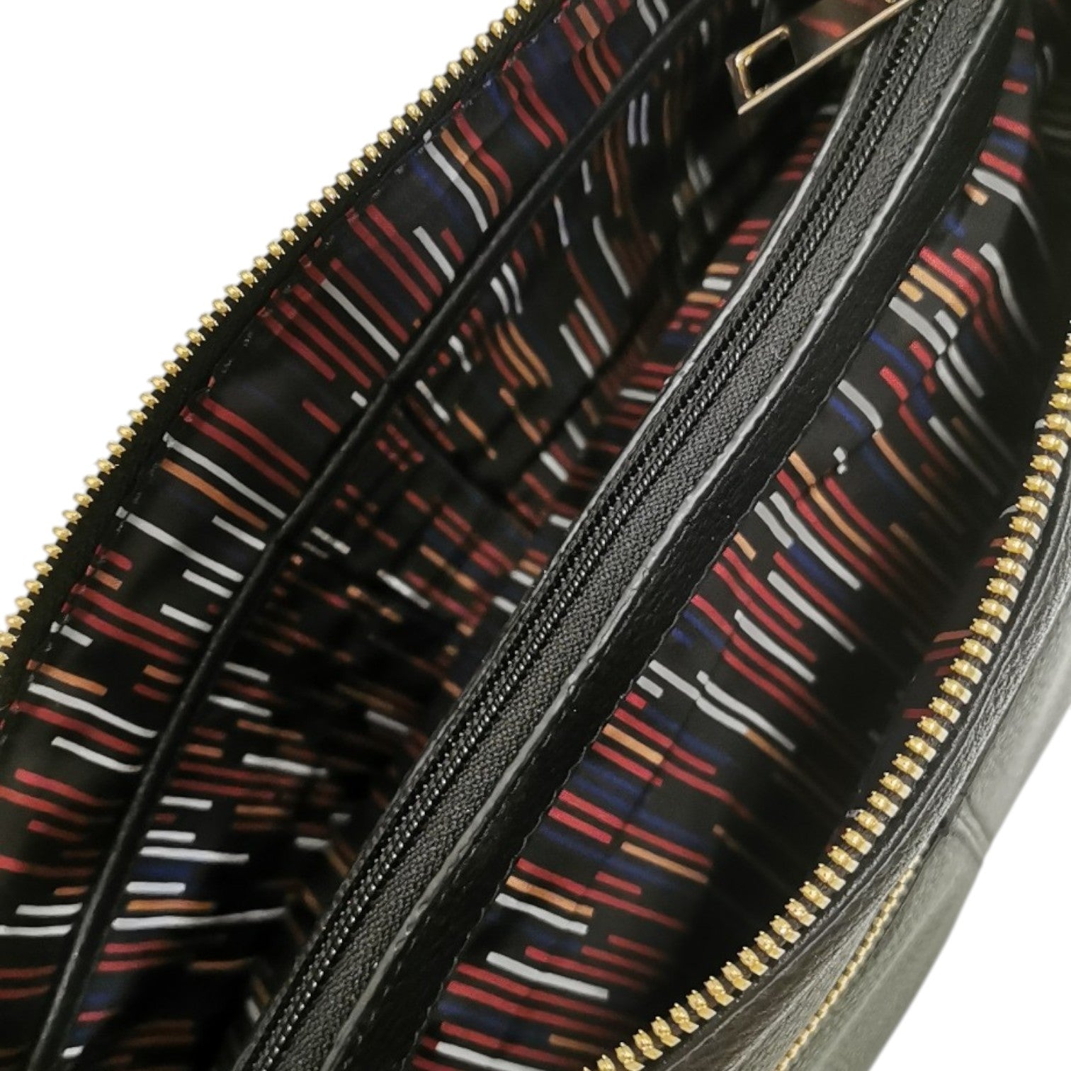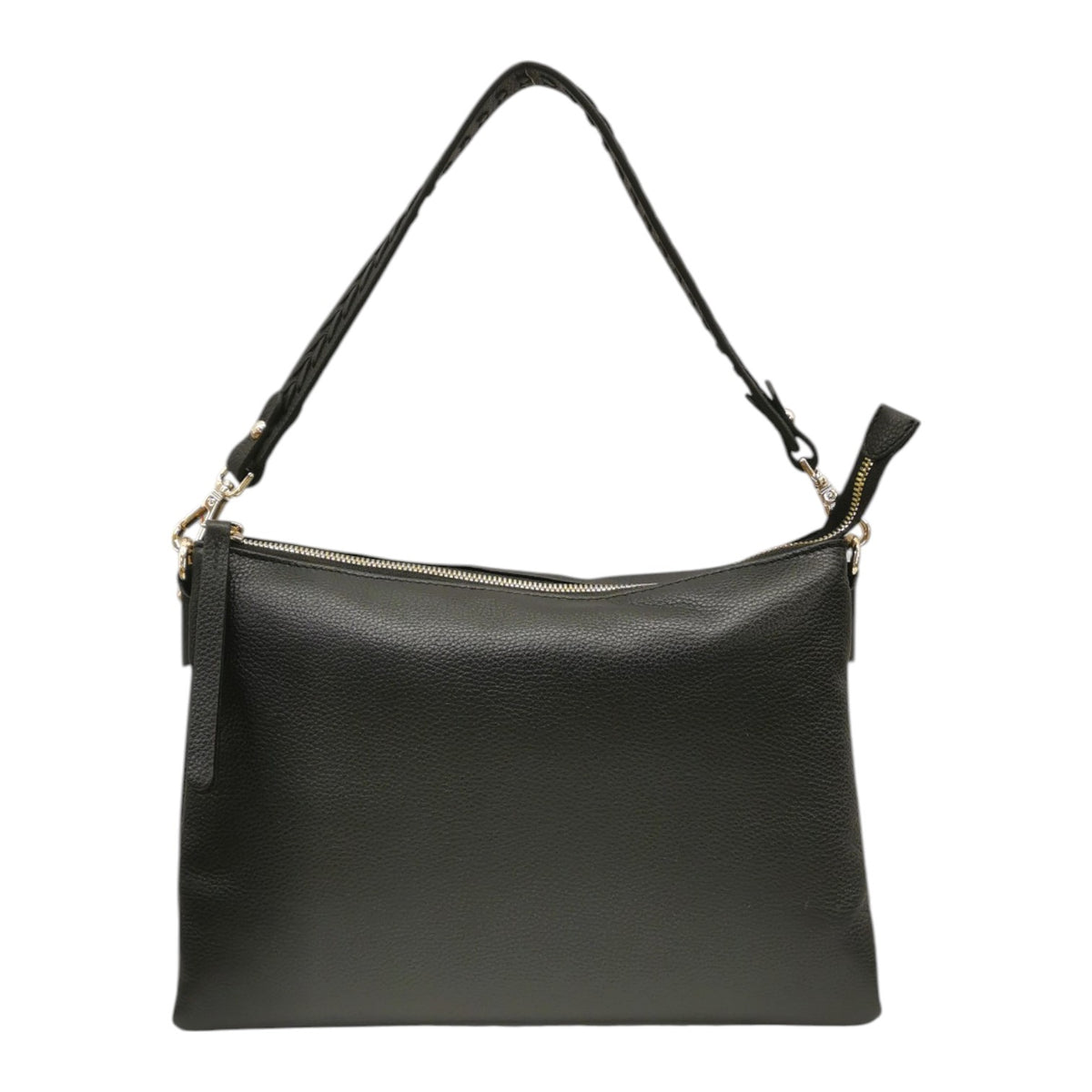 La Borsa a spalla firmata Gianni Conti, realizzata in morbida pelle nella variante nera è caratterizzata da tasca frontale chiusa con zip e da tracolla regolabile e removibile, presenta due soffietti ed interno foderato in tessuto di cui è suddiviso in tre scomparti, quello centrale chiuso con zip.