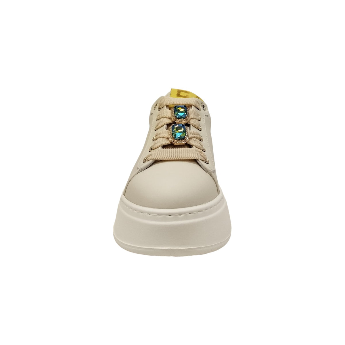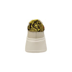 La Sneakers firmata Gio+. realizzata in pelle color latte con talloncino pitonato giallo, è caratterizzata da occhielli in metallo oro e da targhetta sulla linguetta con il logo in laminato oro su fondo giallo e sono applicati accessori passalaccio a forma di gioiello.