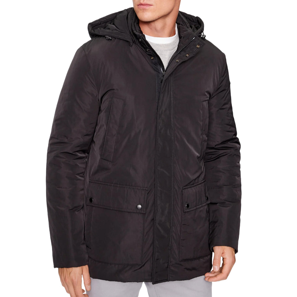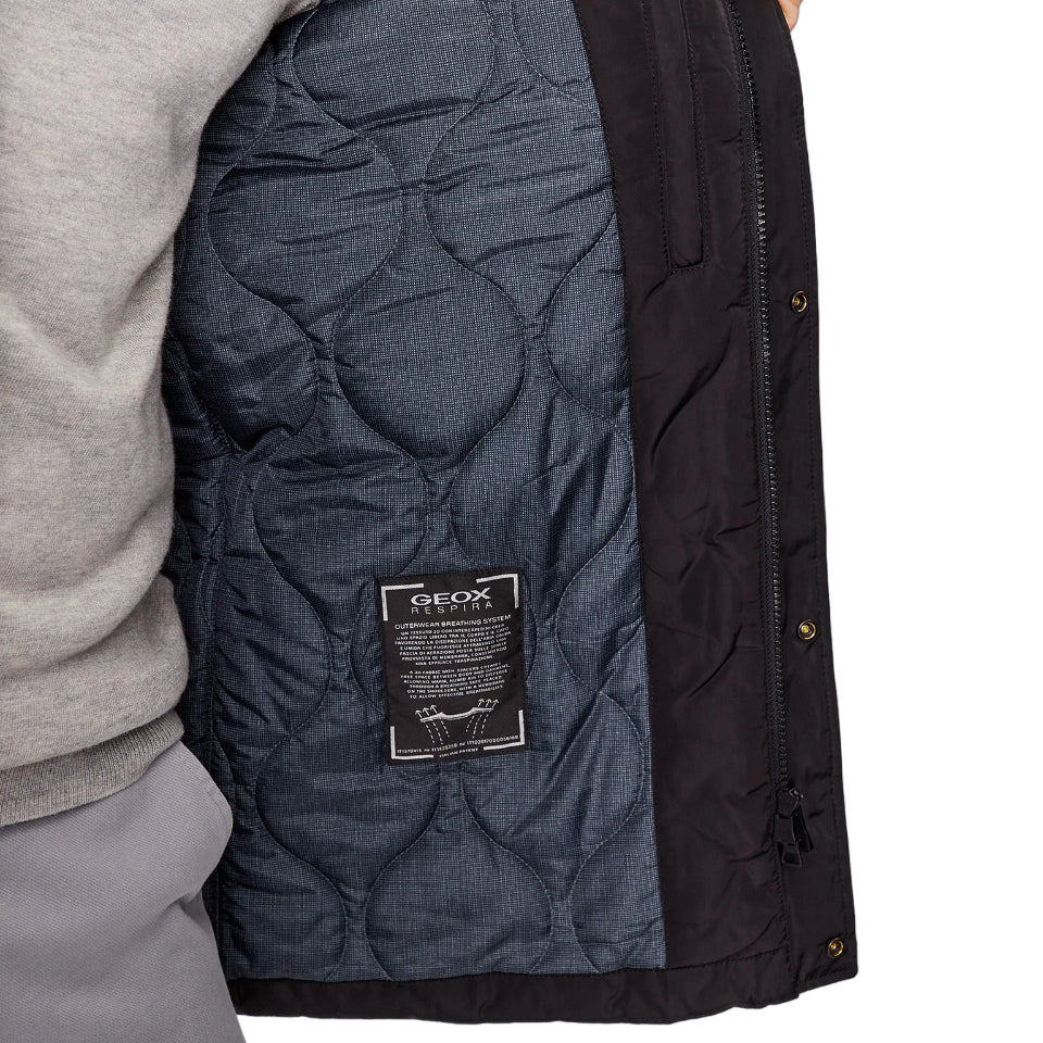 Il Giubbotto firmato Geox, realizzato in twill di poliestere riciclato idrorepellente ed antivento, con imbottitura green, è qui proposto in una sobria variante nera, ed è dotato di una zip nascosta e di pratiche tasche interne ed esterne per tenere al sicuro tutti i tuoi effetti personali.