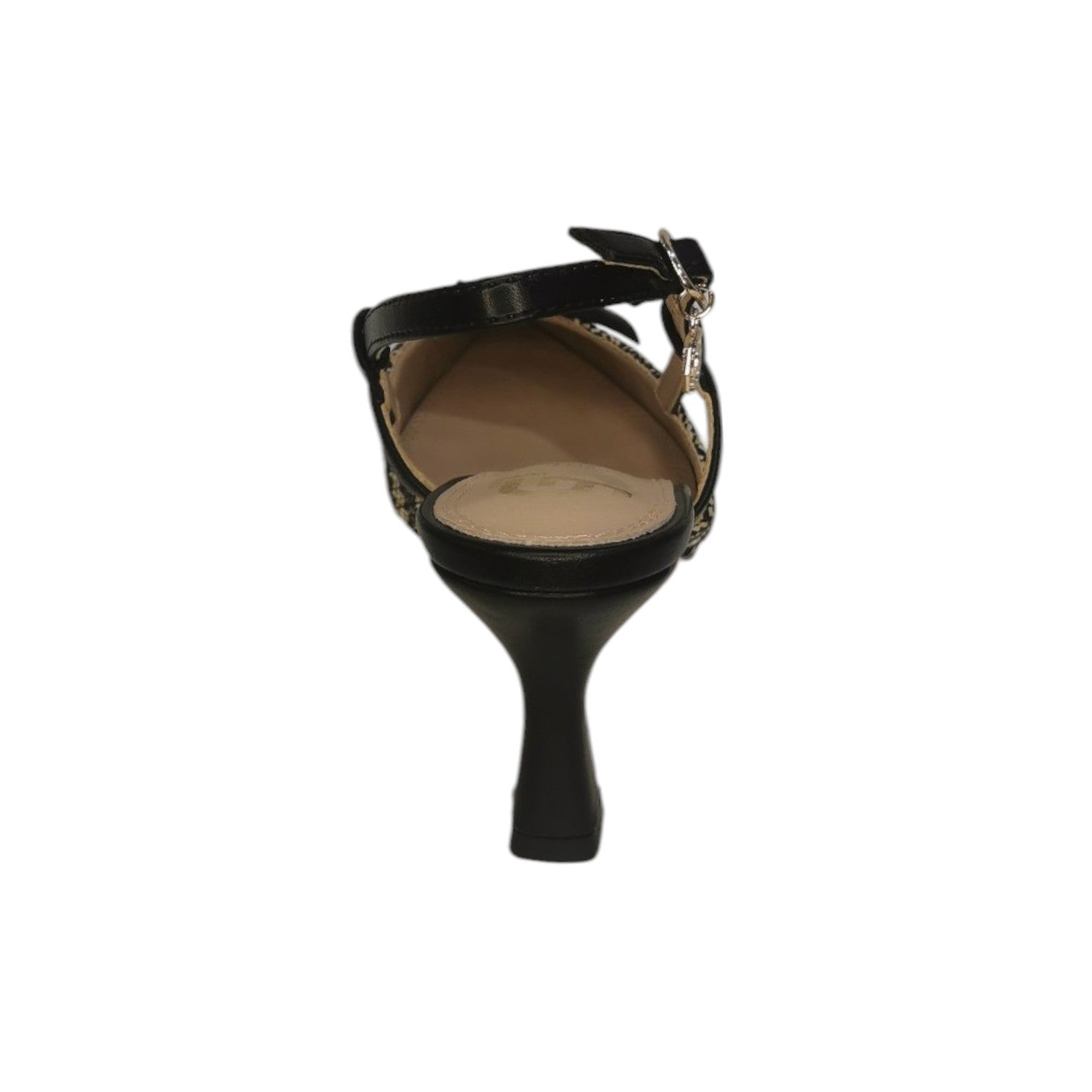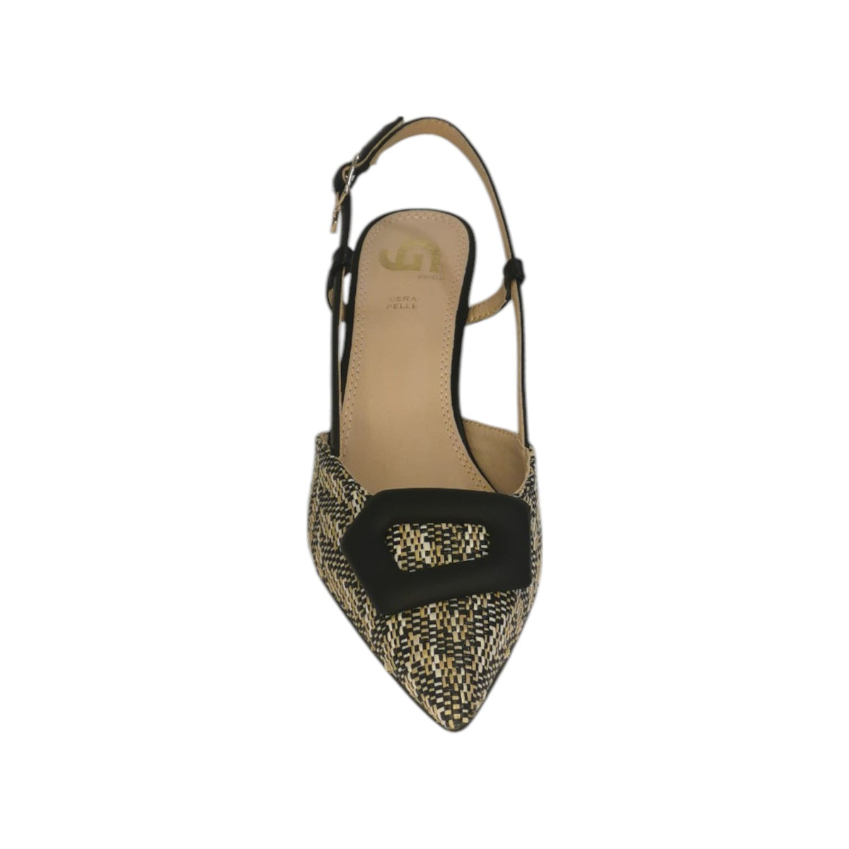 La Chanelle firmata Gold&Gold, realizzata in raffia bicolore intrecciato, in una struttura a punta, con tallone scoperto e cinturino intorno alla caviglia. Plantare anatomico, con soletta in vera pelle, con imbottitura di rinforzo nei punti in cui il piede esercita una maggiore pressione, caratteristica che rende la nostra scarpa particolarmente comoda e confortevole da indossare, il tutto su un fondo con tacco alto 9cm.