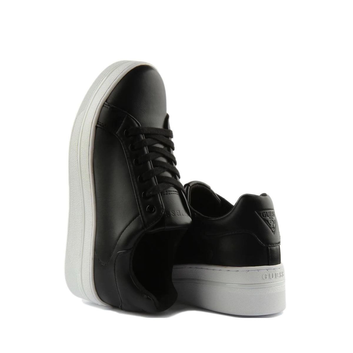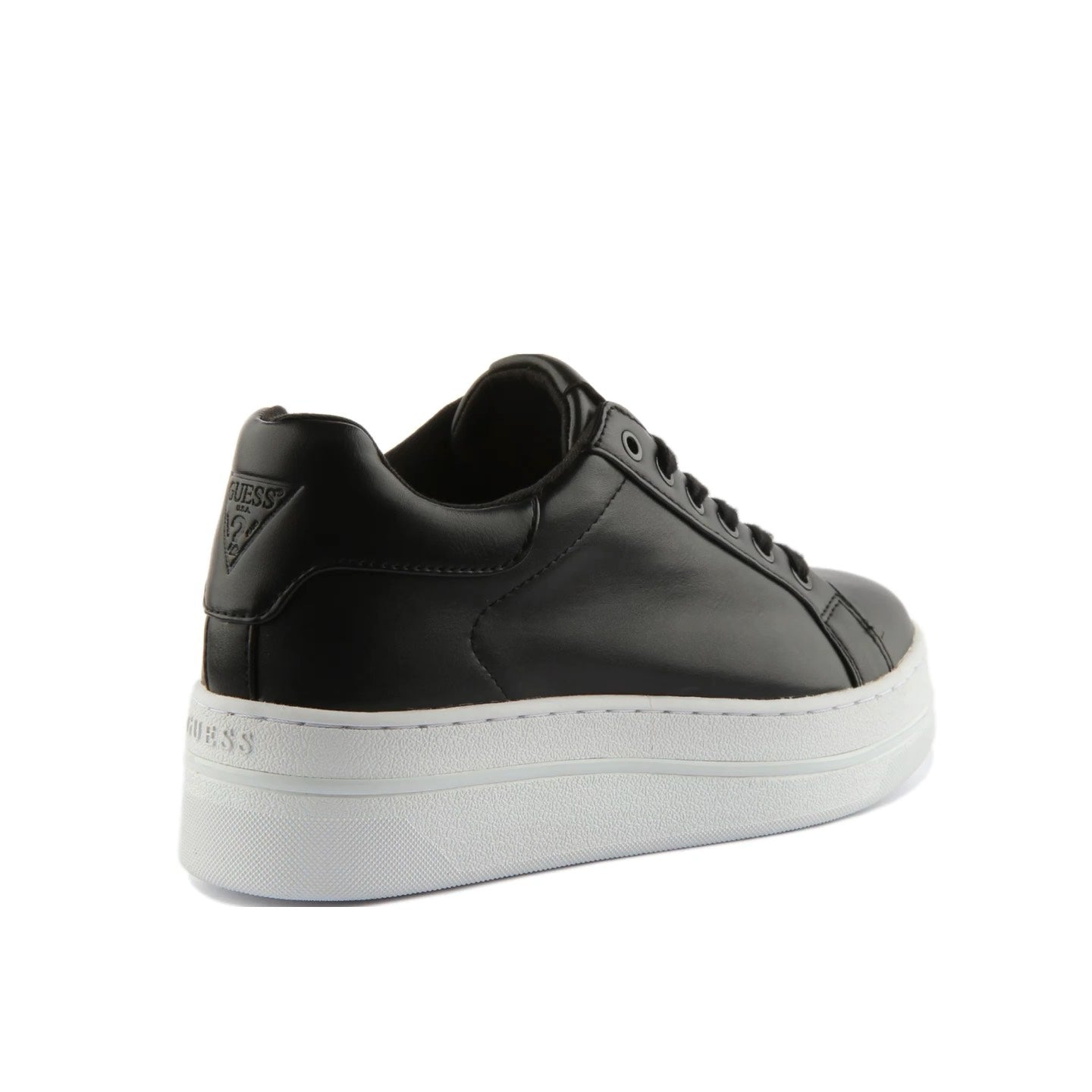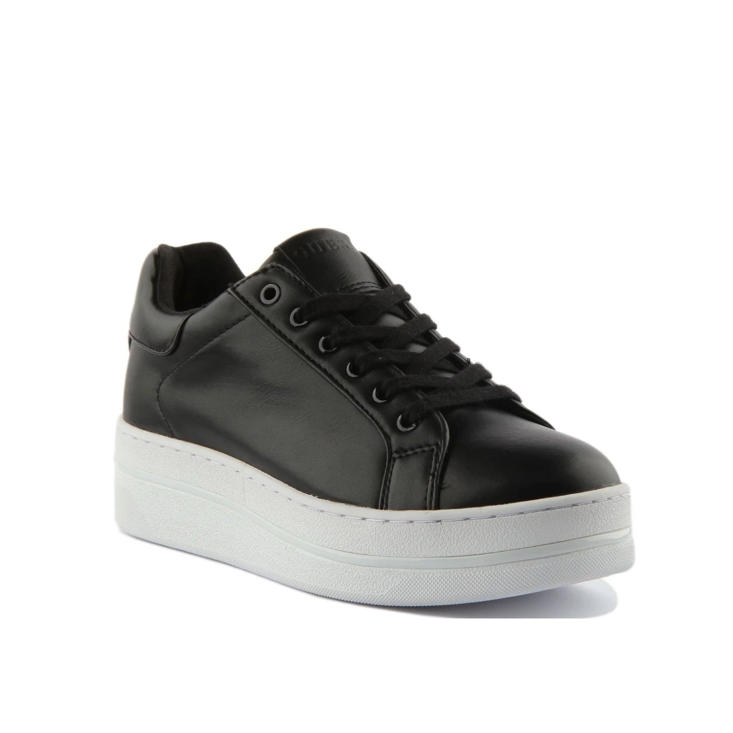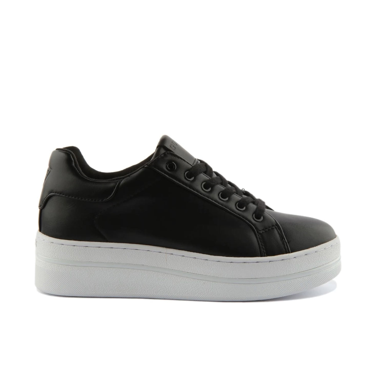 La Sneakers firmata Guess, con design a punta tonda realizzata in ecopelle è caratterizzata da interno e sottopiede estraibile in tessuto e da una suola platform alta 5cm, con fondo in gomma.