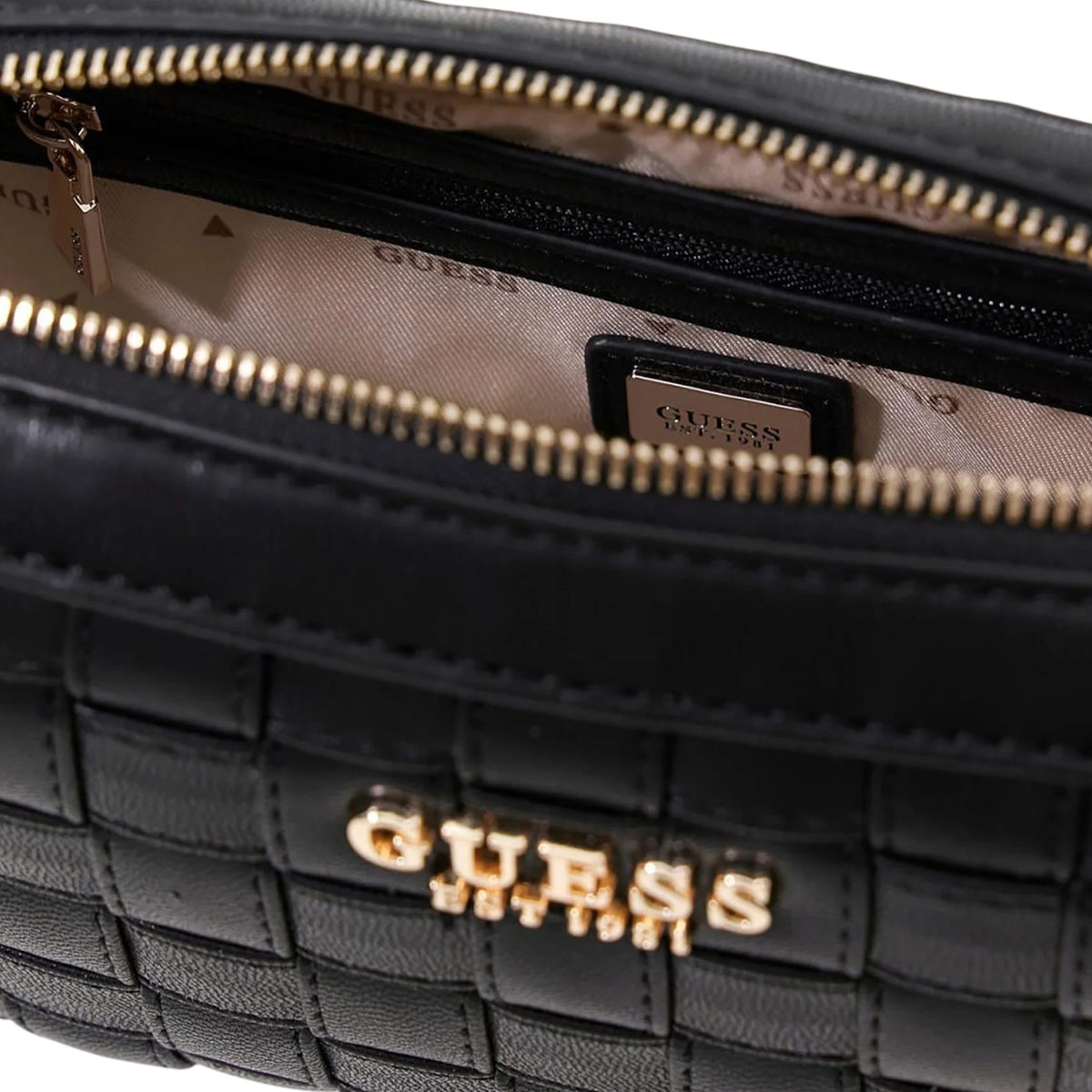 La Borsa a tracolla firmata Guess, realizzata in ecopelle qui proposta nella variante nera con un'accattivante texture intrecciata, presenta lussuosi dettagli color oro, tra cui l'iconico logo frontale e raffinati dettagli a catena che catturano la luce in modo impeccabile. La tracolla regolabile e removibile offre versatili opzioni di stile, mentre i piedini protettivi dorati proteggono la base della borsa. All'interno, scopri un'organizzazione intelligente con uno scomparto con cerniera e tre slot dedicati per carte, il tutto rifinito con pregiati dettagli dorati. Perfetta per la praticità di avere le mani libere senza rinunciare al fascino del design.