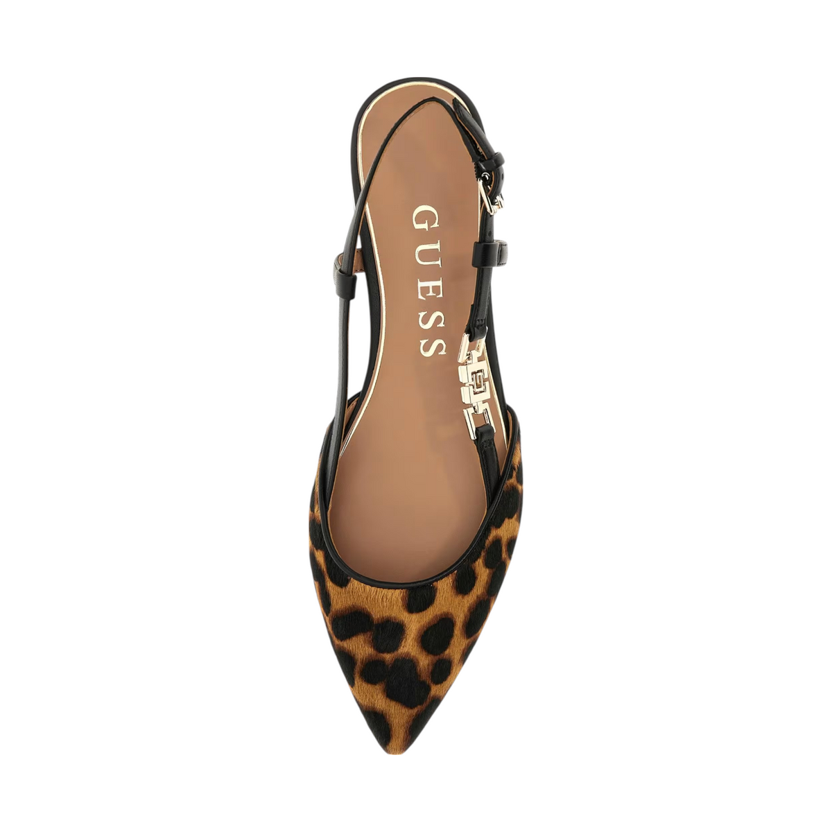 La Chanelle firmata Guess, realizzata in 60% Vera Pelle 40% Poliuretano, è caratterizzata da effetto cavallino con stampa animalier, e dettaglio scritta logo laterale. Inoltre presenta un comodo sottopiede in pelle e fodera interna in tessuto.